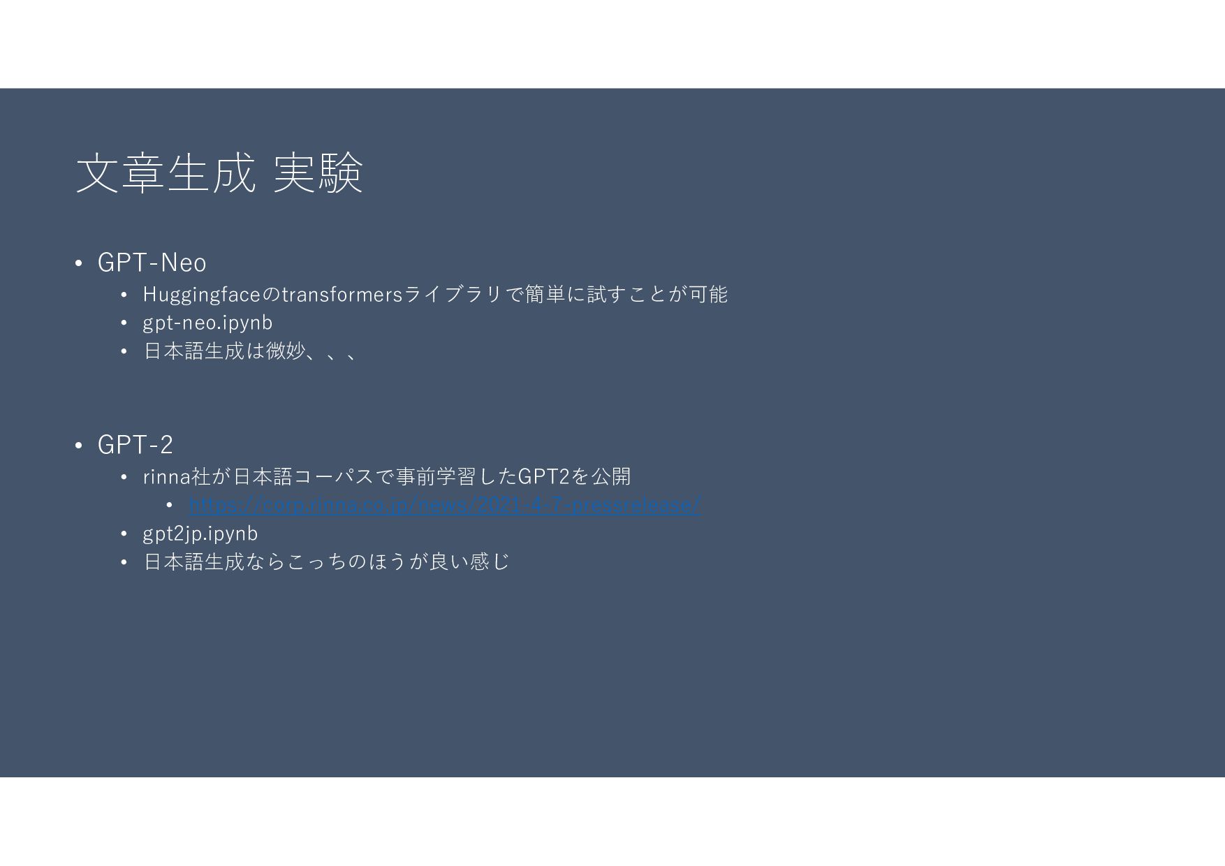 文章生成 実験 • GPT-Neo • Huggingfaceのtransformersライブラリで簡単に試すことが可能 • gpt-neo.ipynb • 日本語生成は微妙、、、