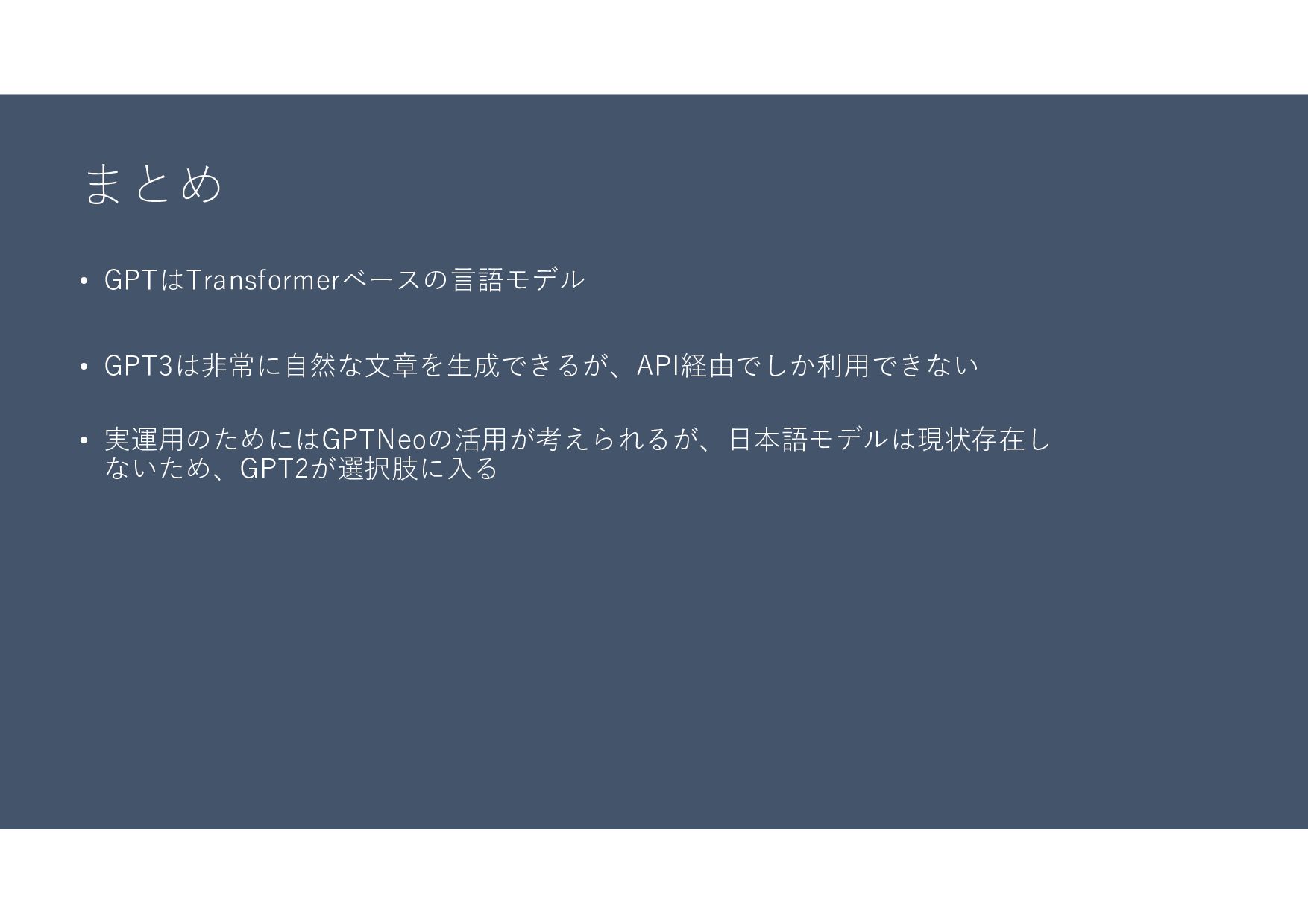 まとめ • GPTはTransformerベースの言語モデル • GPT3は非常に自然な文章を生成できるが、API経由でしか利用できない • 実運用のためにはGPTNeoの活用が考えられるが、日本語モデルは現状存在し ないため、GPT2が選択肢に入る