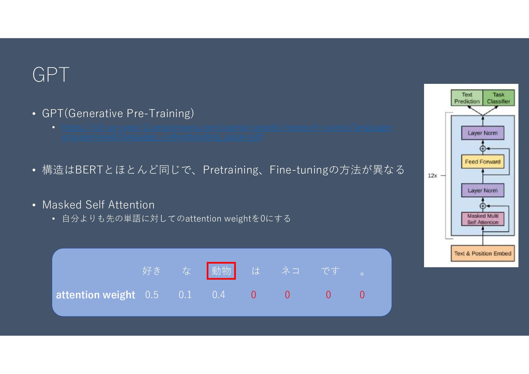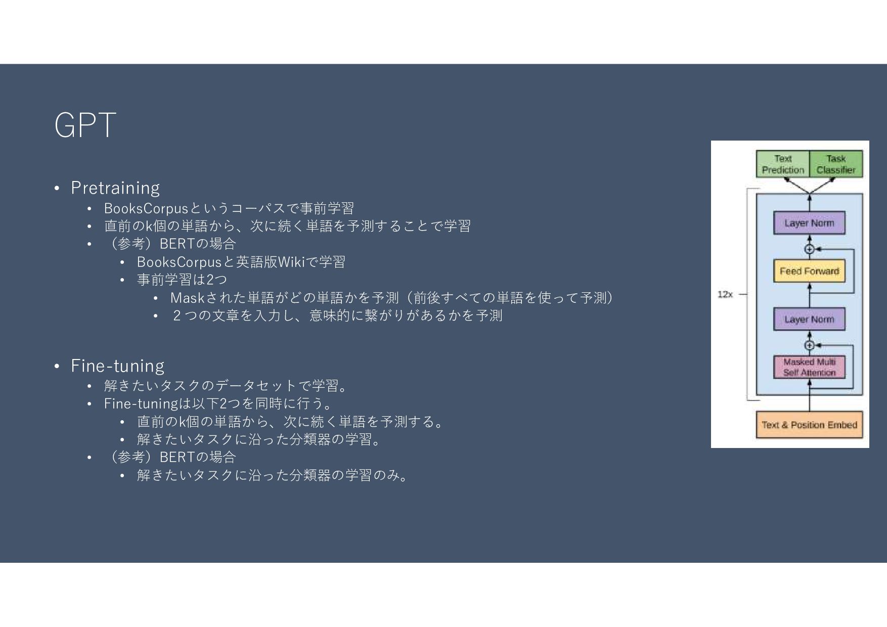 GPT • GPT(Generative Pre-Training) • https://s3-us-west-2.amazonaws.com/openai-assets/research-covers/language- unsupervised/language_understanding_paper.pdf • 構造はBERTとほとんど同じで、Pretraining、Fine-tuningの方法が異なる •