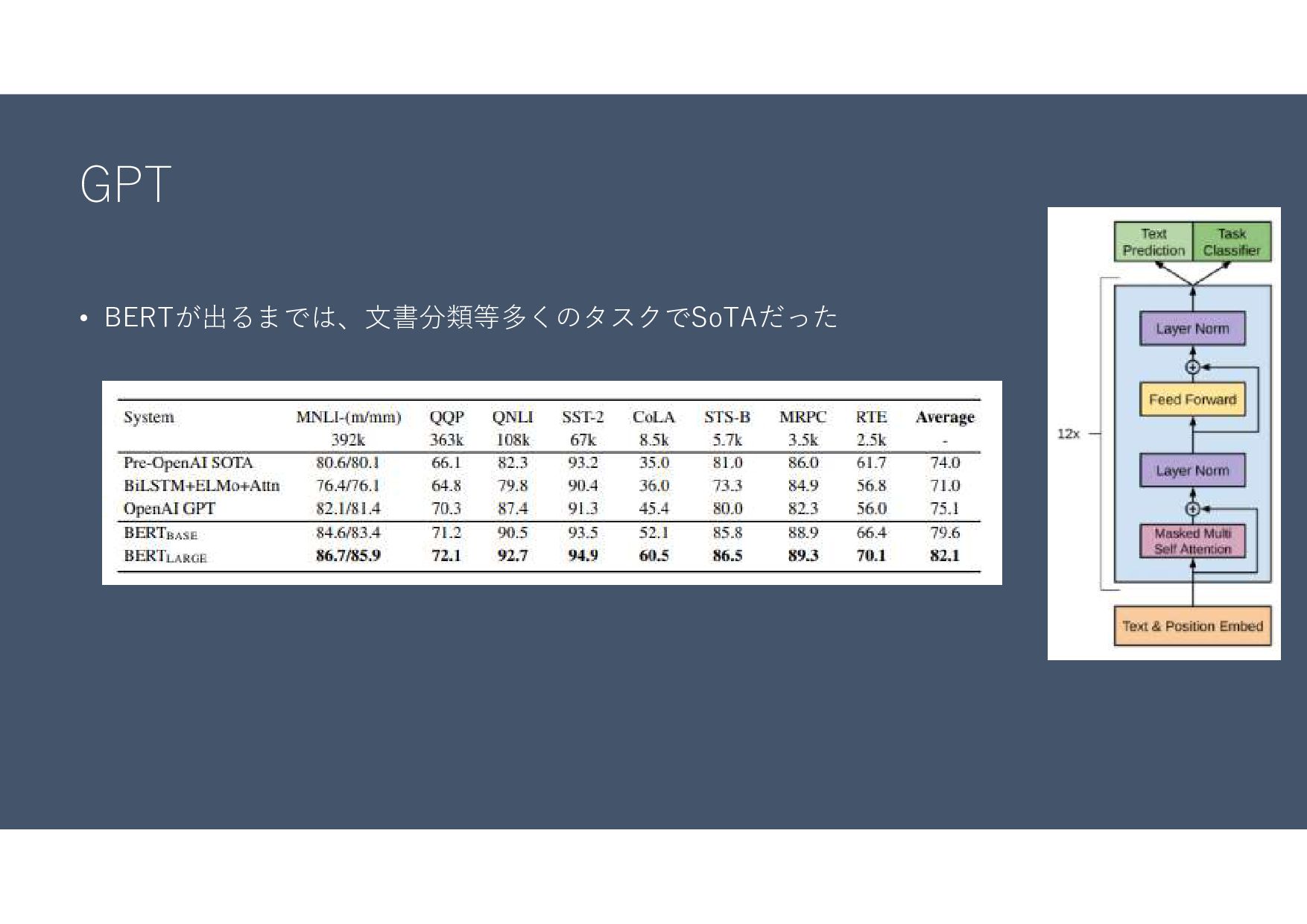 GPT • BERTが出るまでは、文書分類等多くのタスクでSoTAだった