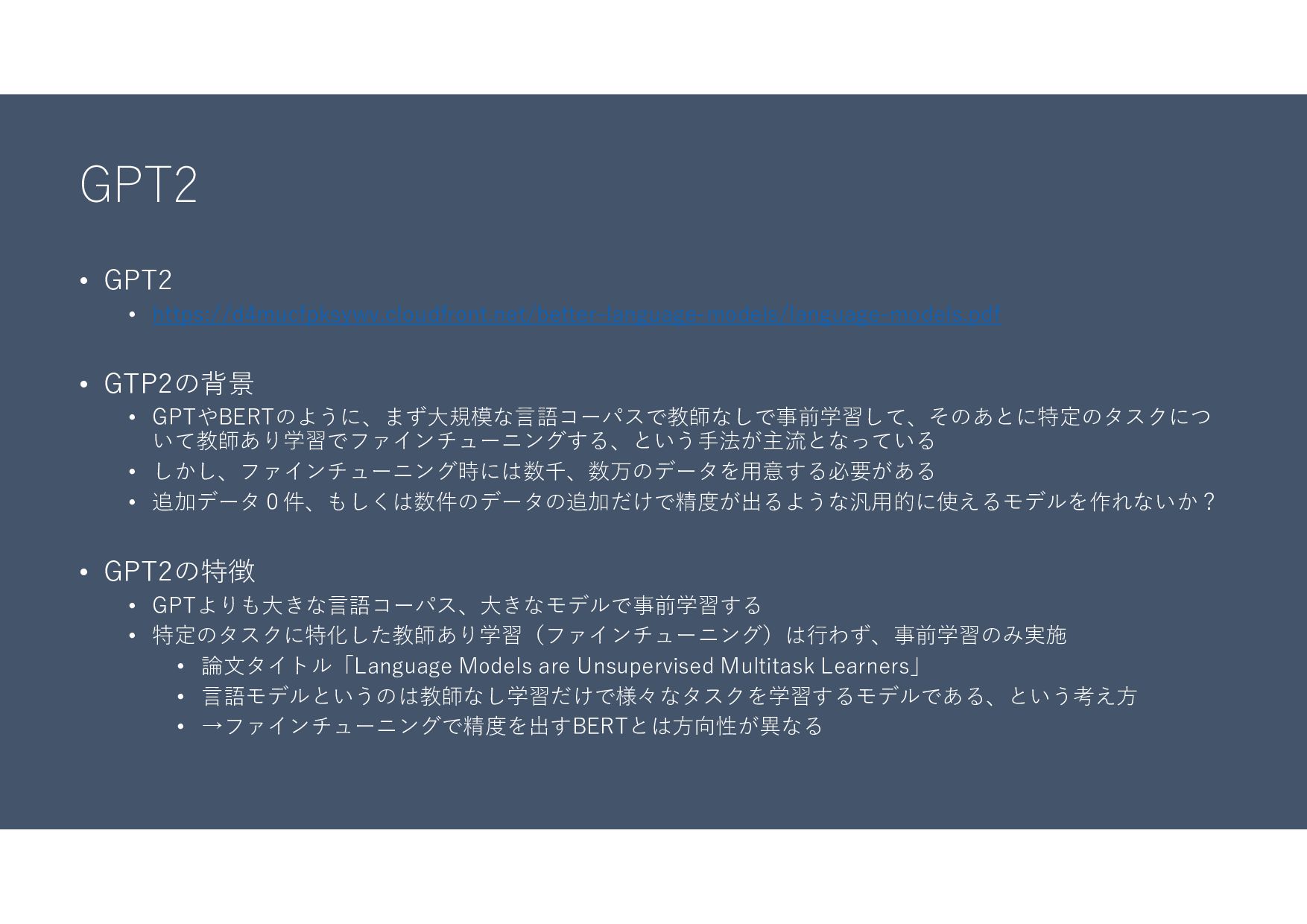 • しかし、ファインチューニング時には数千、数万のデータを用意する必要がある • 追加データ0件、もしくは数件のデータの追加だけで精度が出るような汎用的に使えるモデルを作れないか? • GPT2の特徴 • GPTよりも大きな言語コーパス、大きなモデルで事前学習する • 特定のタスクに特化した教師あり学習(ファインチューニング)は行わず、事前学習のみ実施 • 論文タイトル「Language Models are Unsupervised Multitask Learners」 • 言語モデルというのは教師なし学習だけで様々なタスクを学習するモデルである、という考え方 • →ファインチューニングで精度を出すBERTとは方向性が異なる