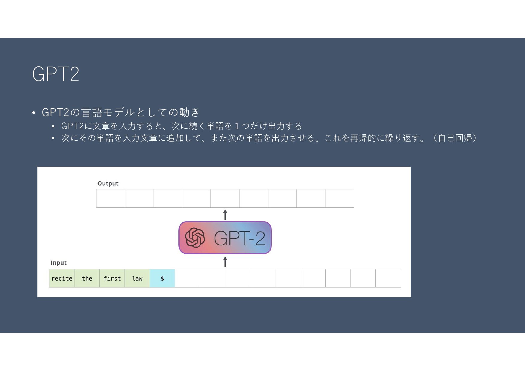 GPT2 • GPT2の言語モデルとしての動き • GPT2に文章を入力すると、次に続く単語を1つだけ出力する • 次にその単語を入力文章に追加して、また次の単語を出力させる。これを再帰的に繰り返す。(自己回帰)