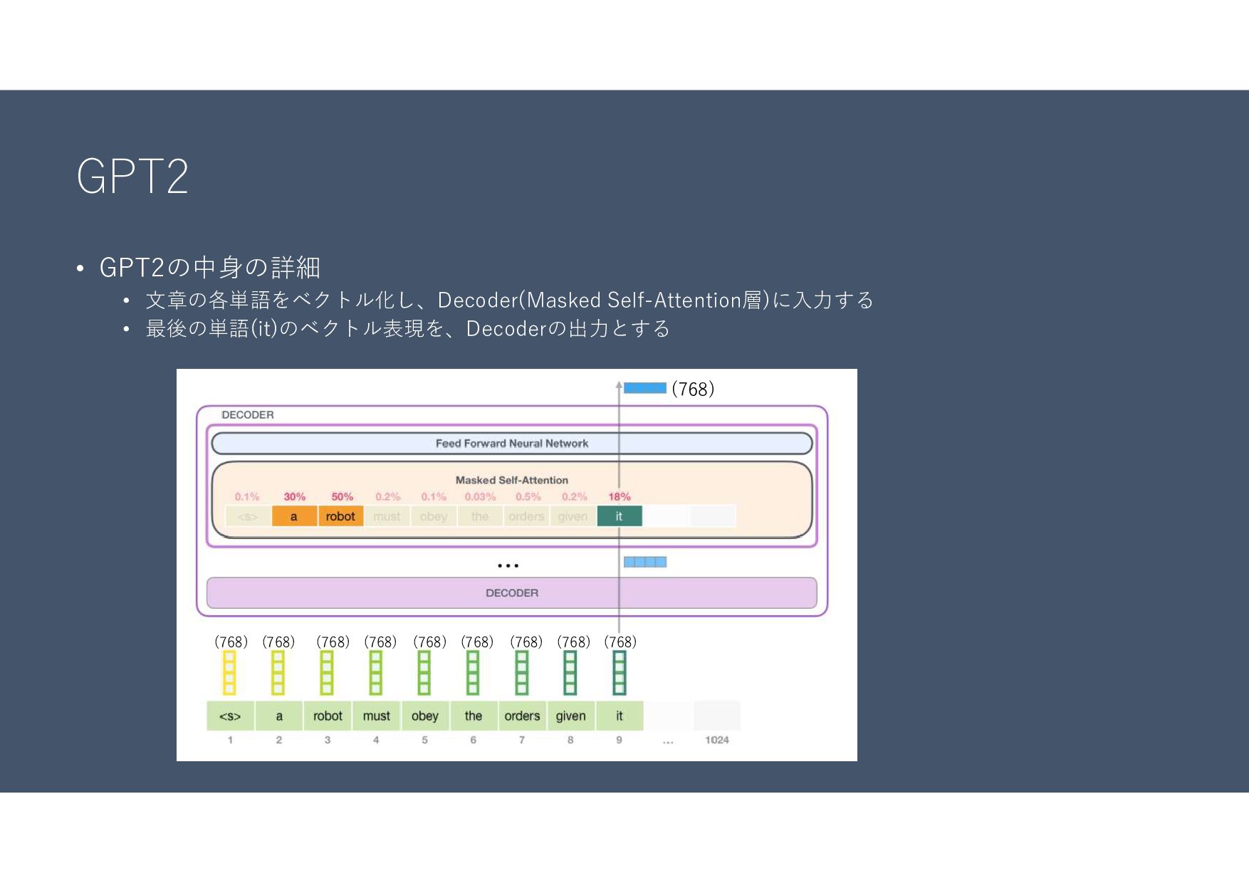 GPT2 • GPT2の中身の詳細 • 文章の各単語をベクトル化し、Decoder(Masked Self-Attention層)に入力する • 最後の単語(it)のベクトル表現を、Decoderの出力とする (768) (768)