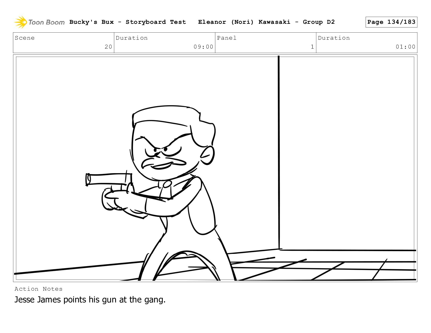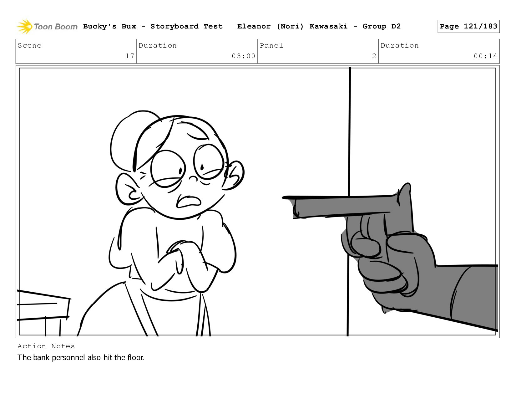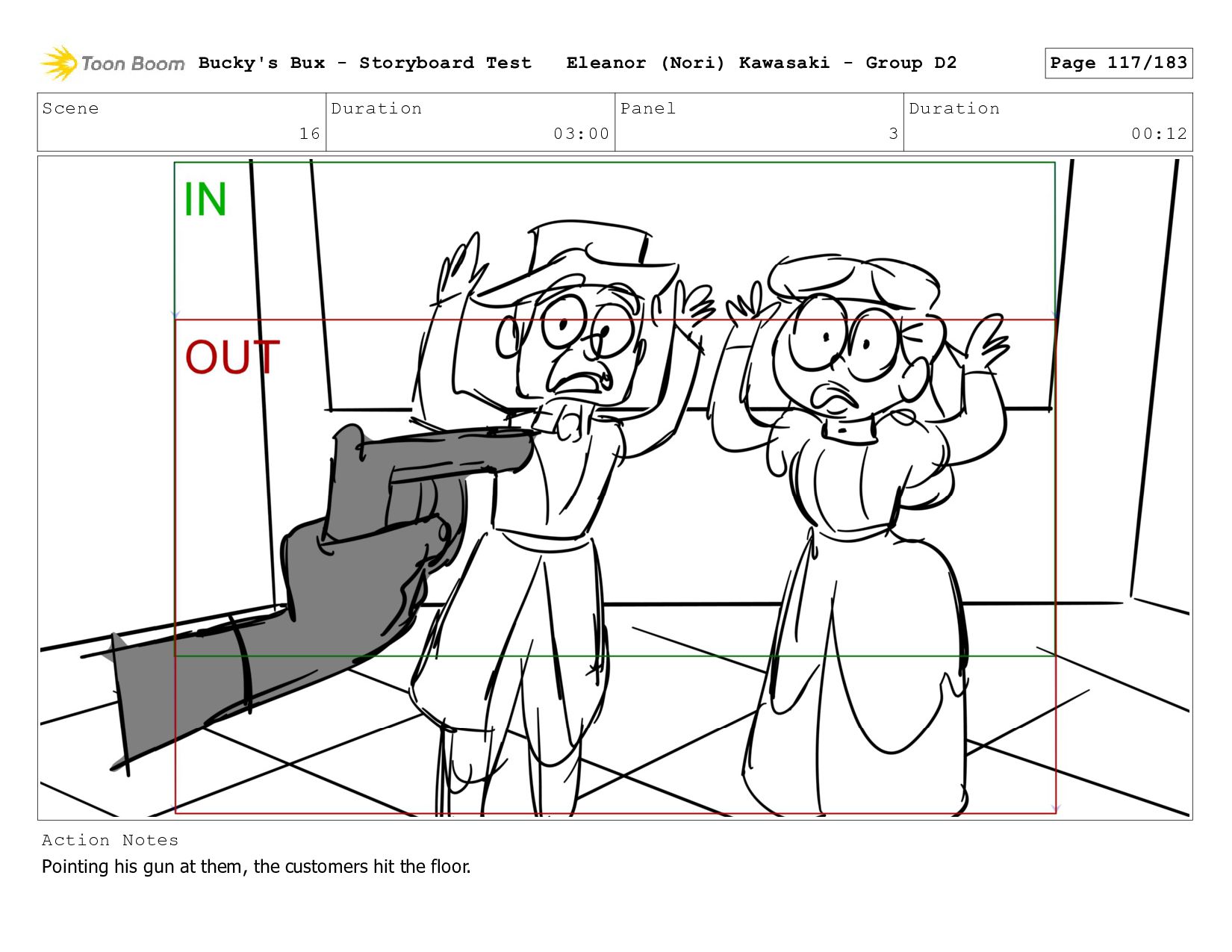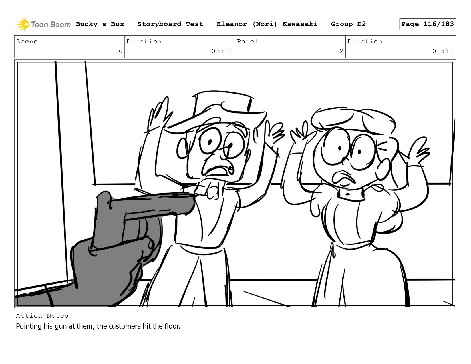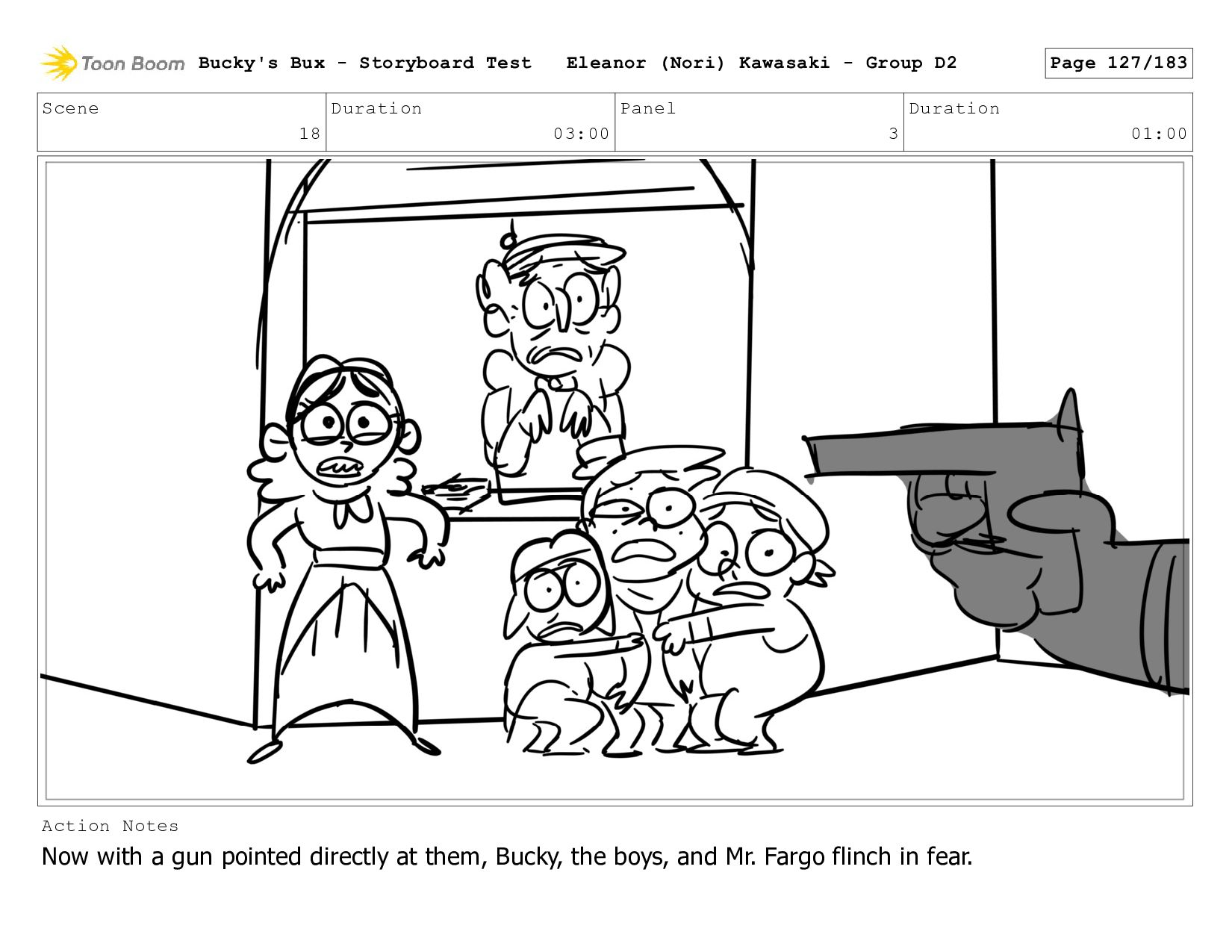 Now with a gun pointed directly at them, Bucky, the boys, and Mr. Fargo flinch in fear. Bucky's Bux - Storyboard Test Eleanor (Nori) Kawasaki - Group D2 Page 127/183
