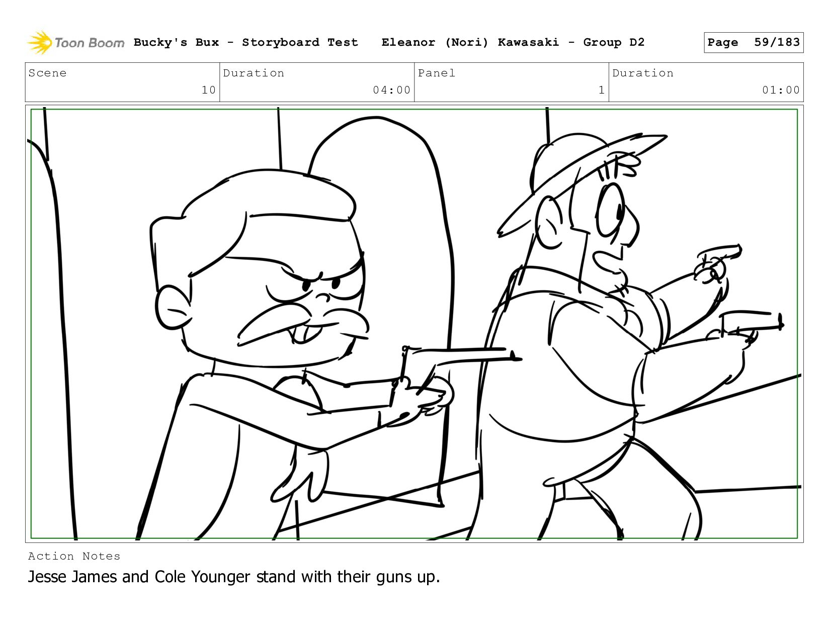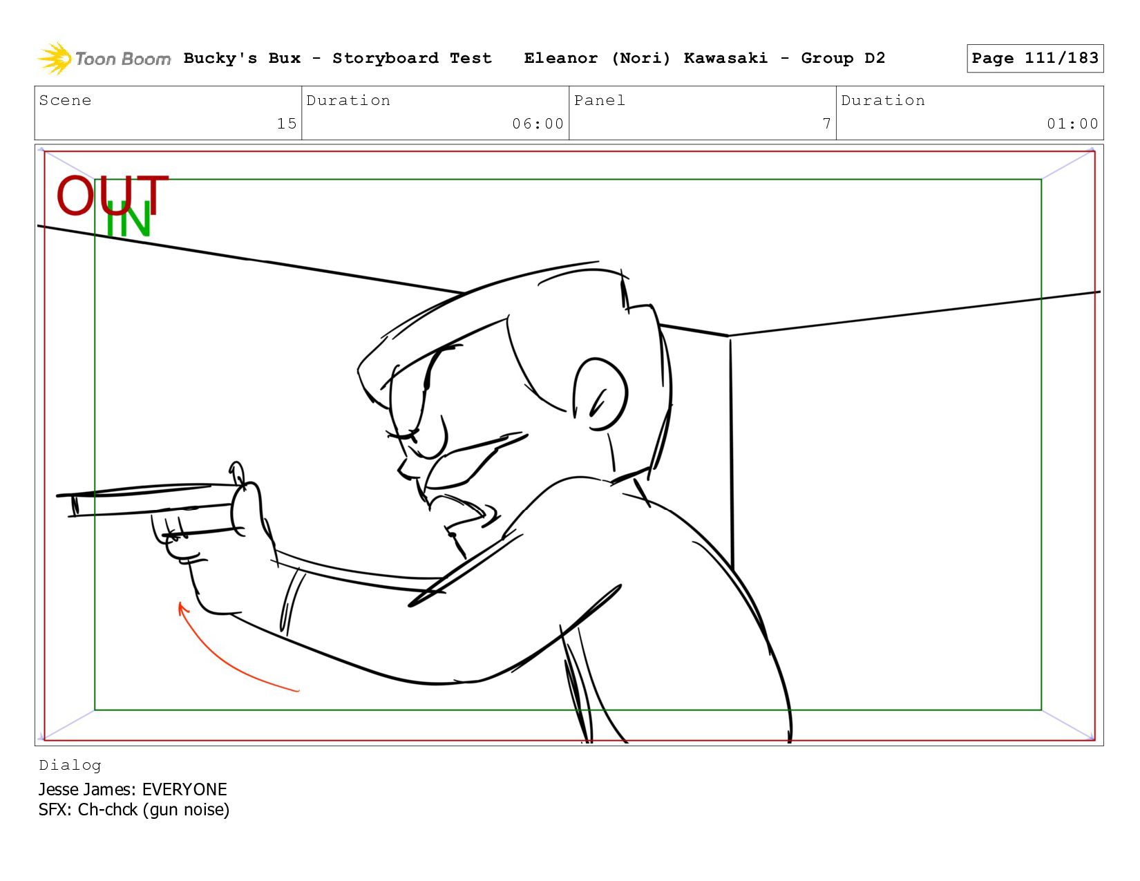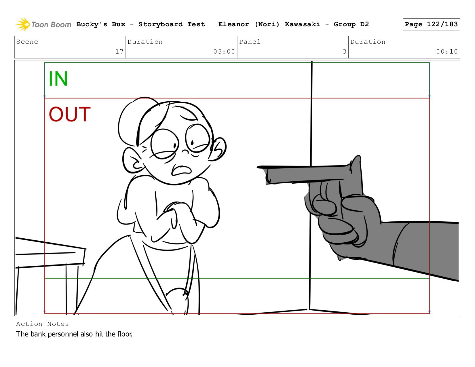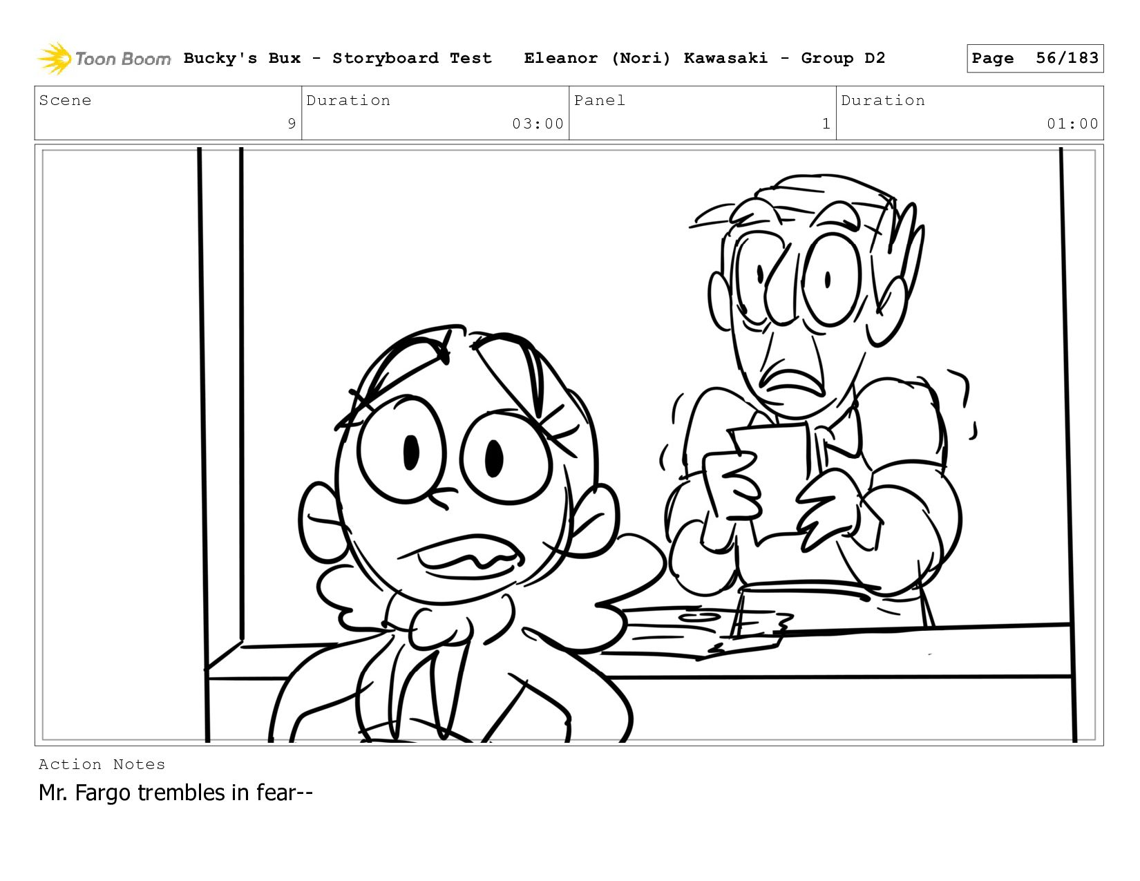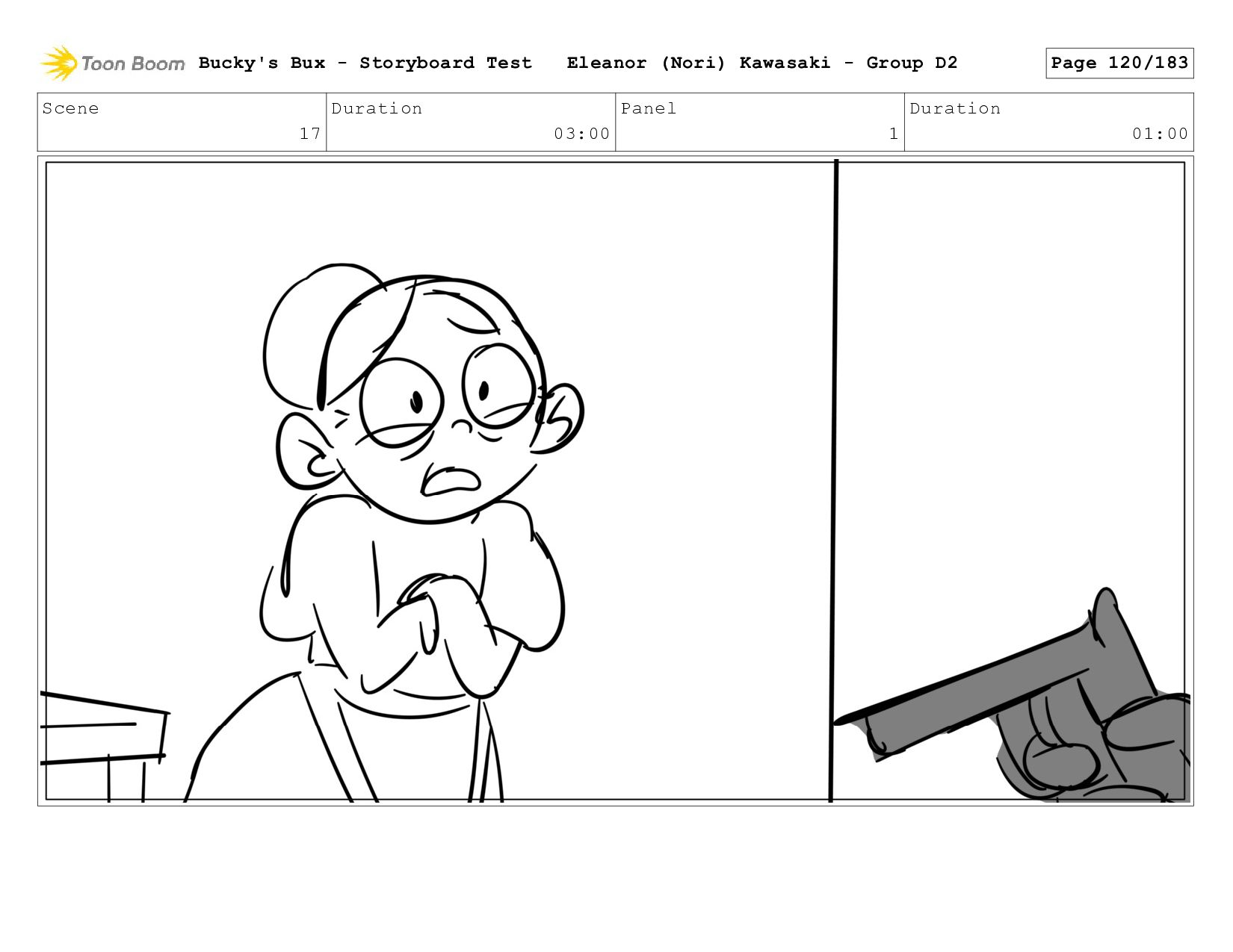Now with a gun pointed directly at them, Bucky, the boys, and Mr. Fargo flinch in fear. Bucky's Bux - Storyboard Test Eleanor (Nori) Kawasaki - Group D2 Page 127/183