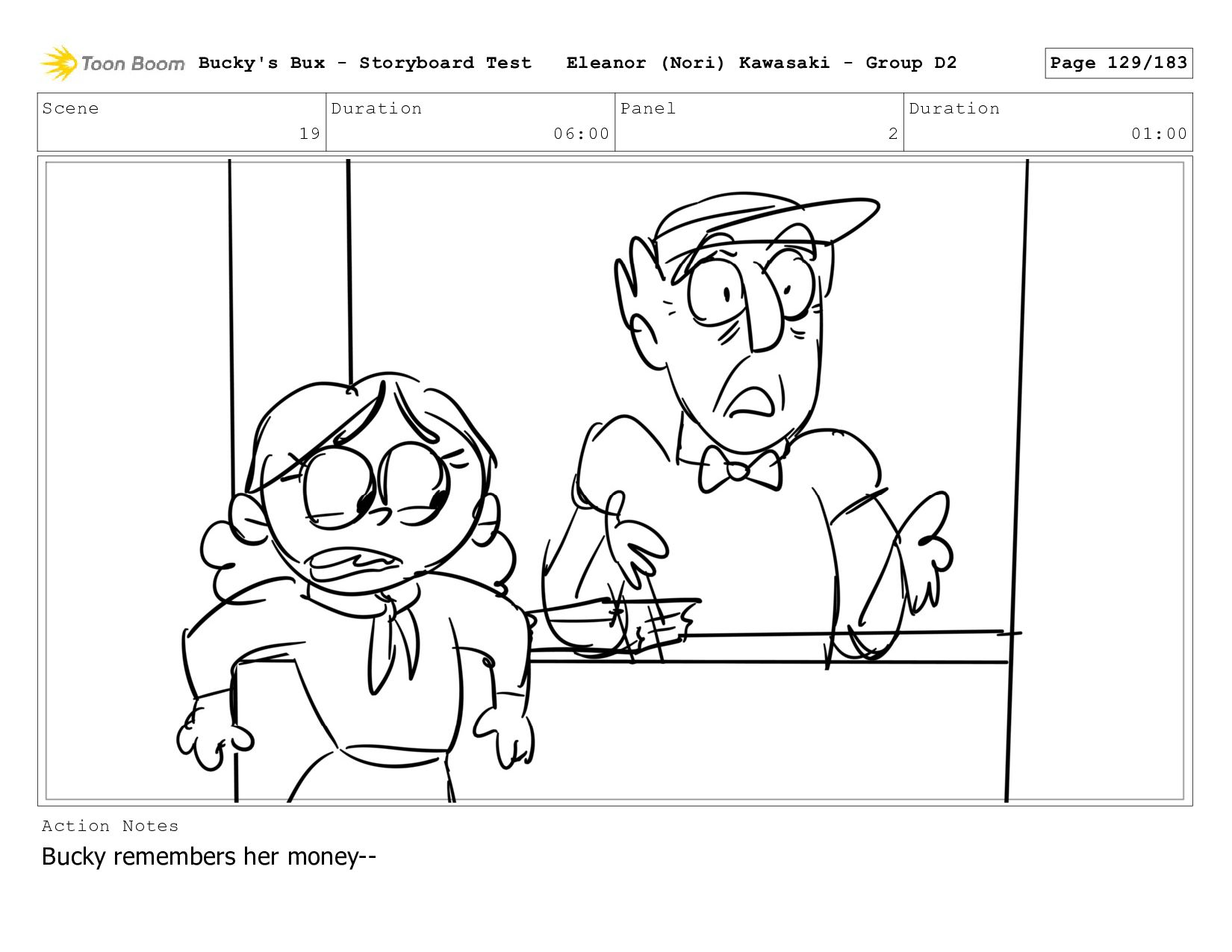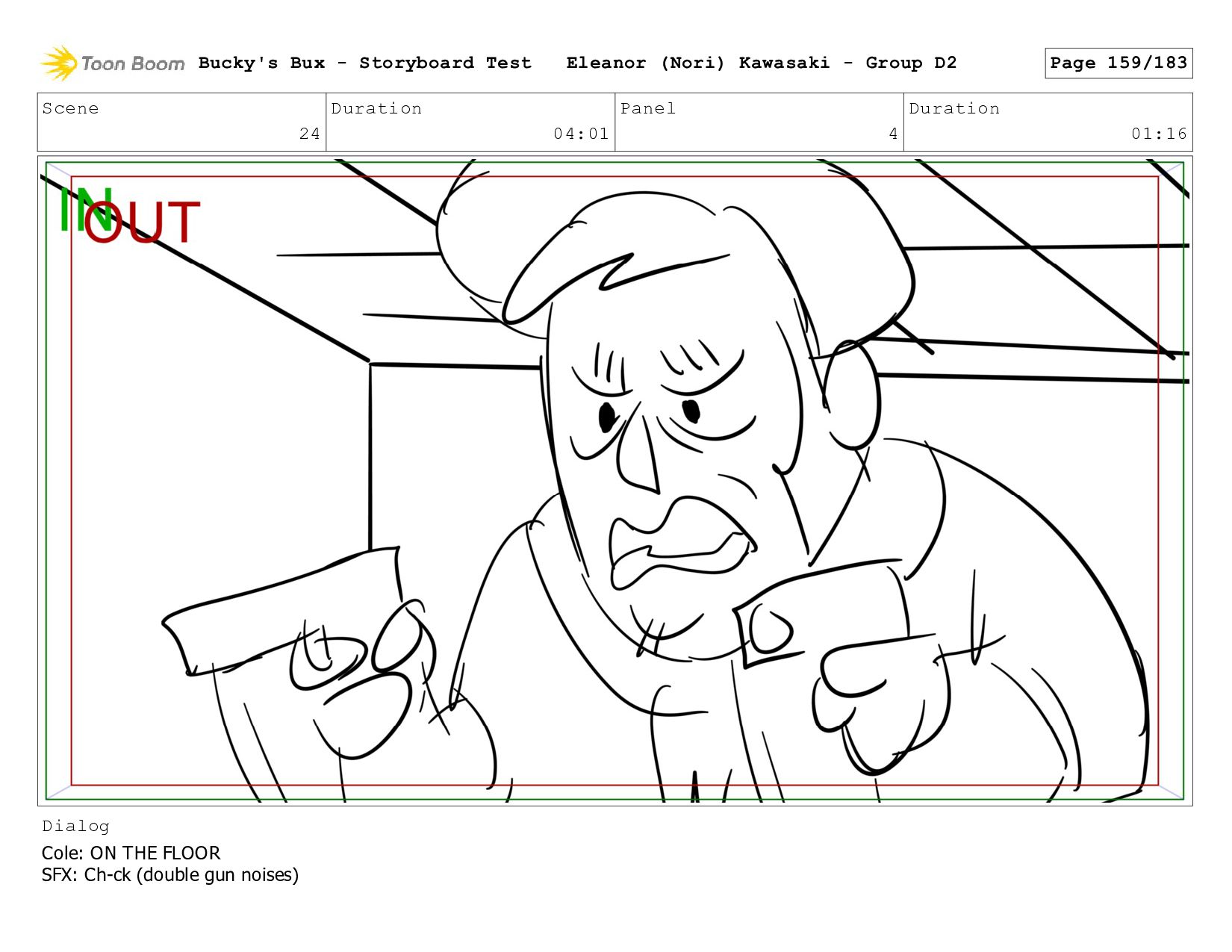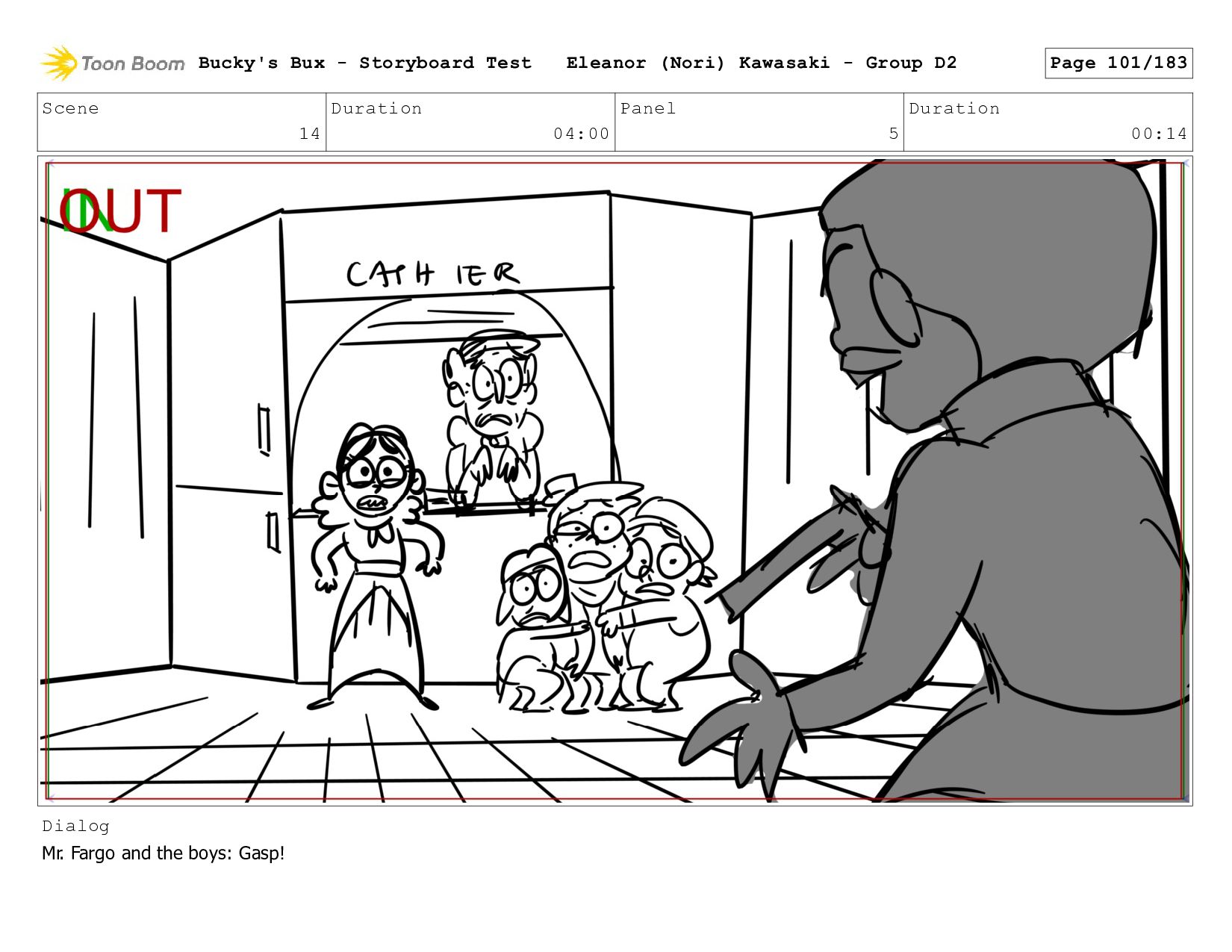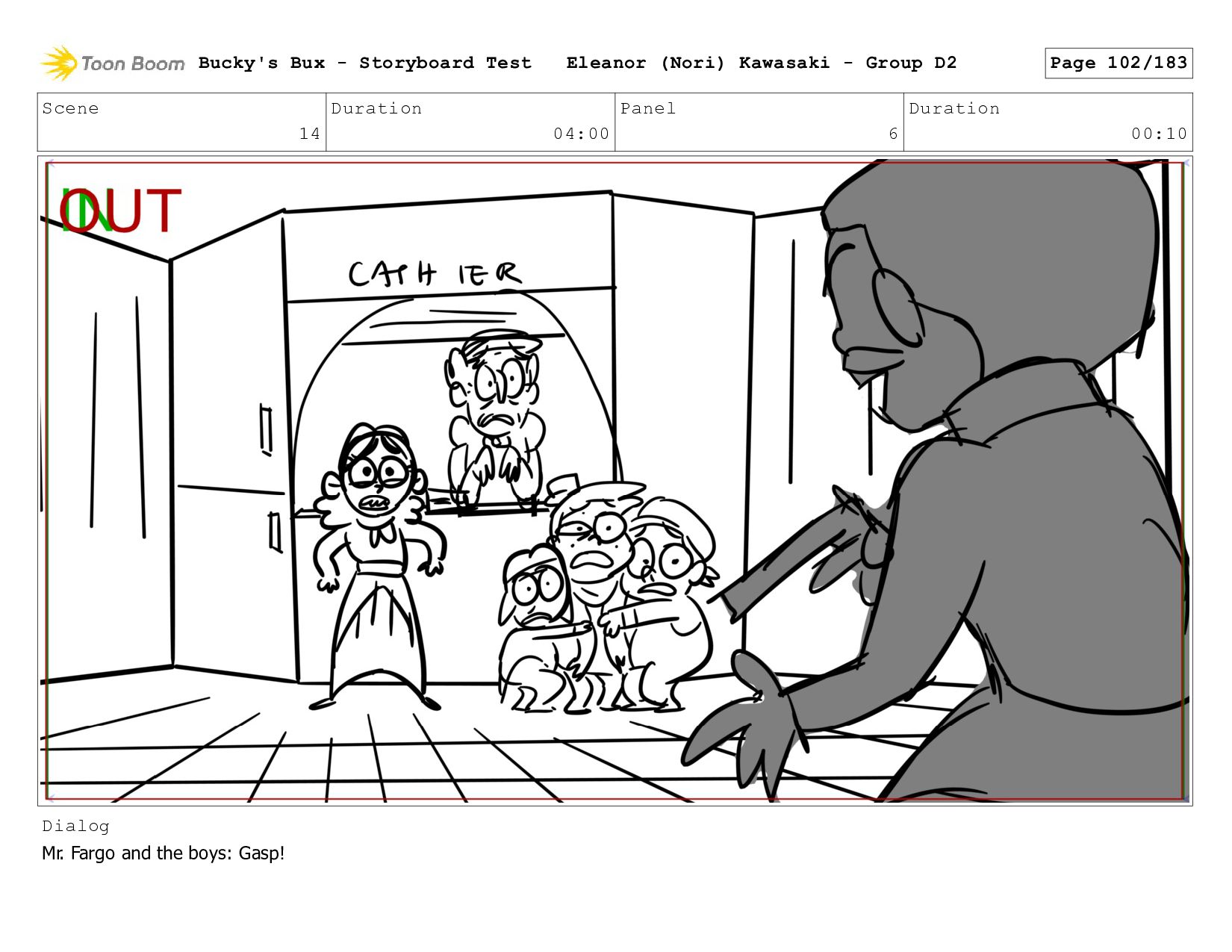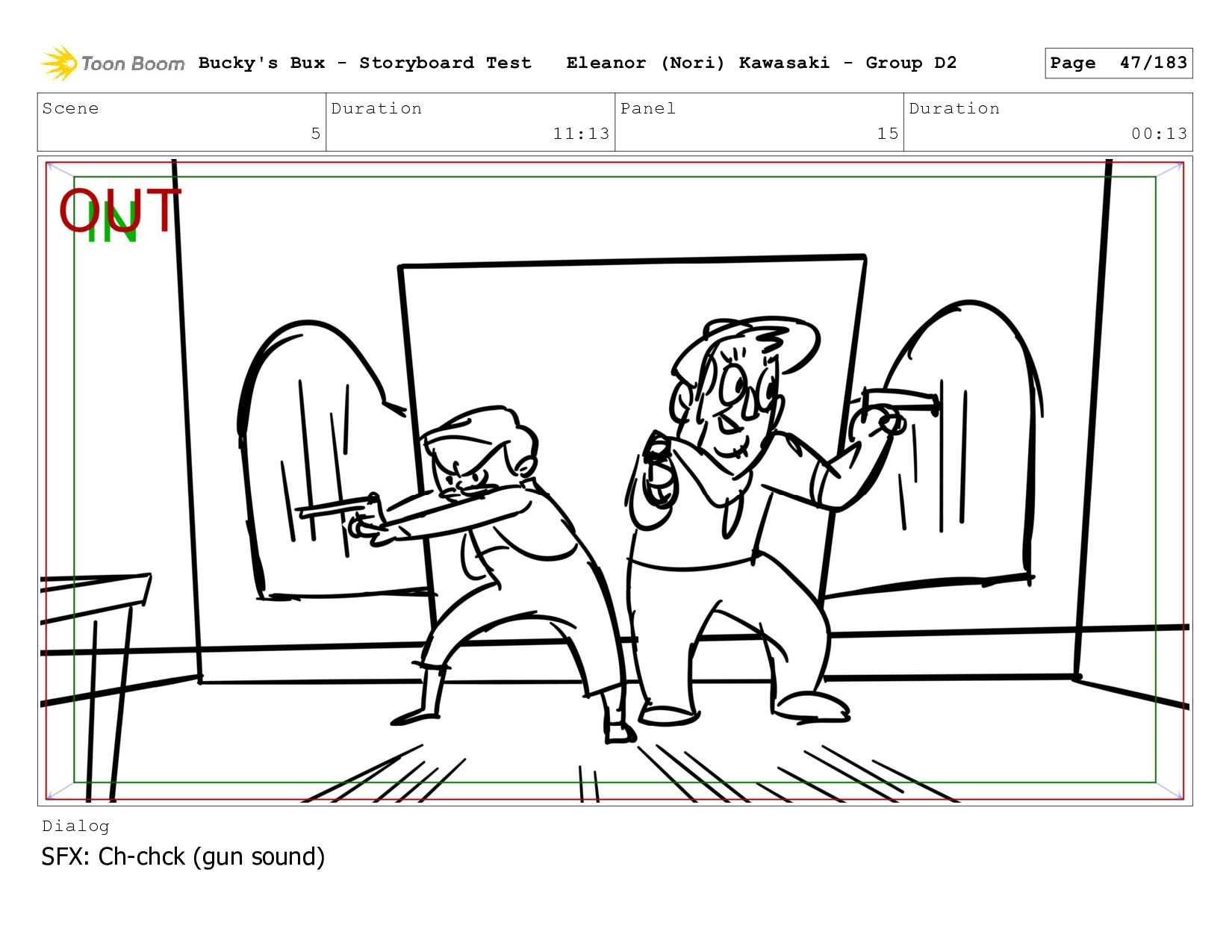 Now with a gun pointed directly at them, Bucky, the boys, and Mr. Fargo flinch in fear. Bucky's Bux - Storyboard Test Eleanor (Nori) Kawasaki - Group D2 Page 127/183