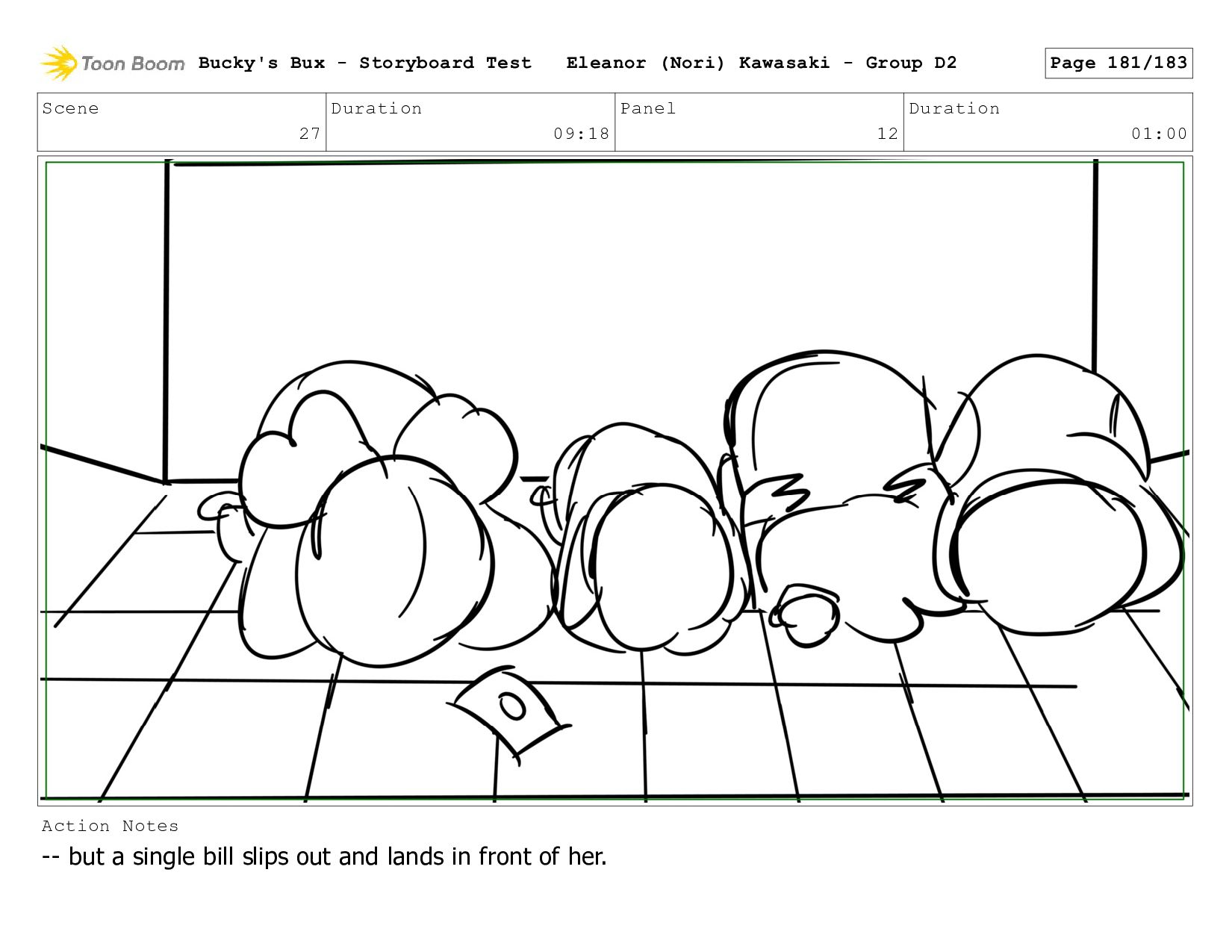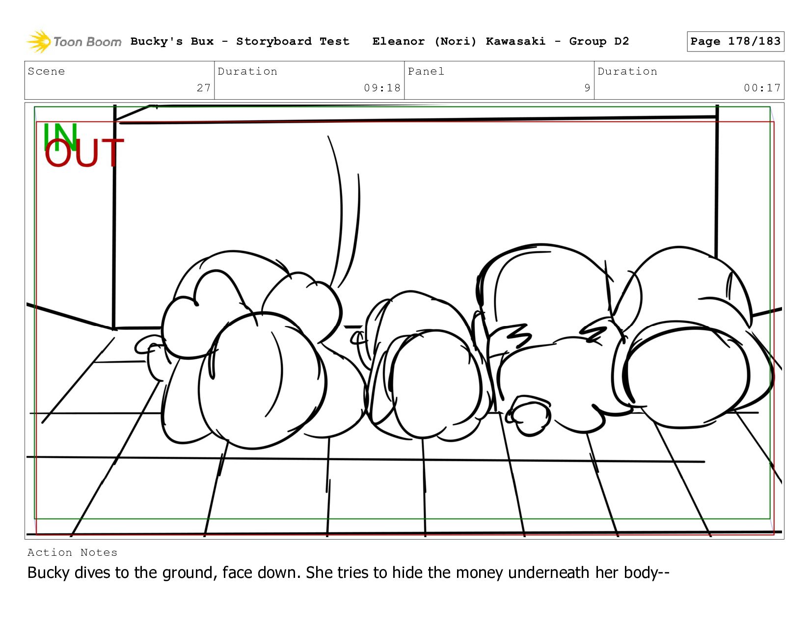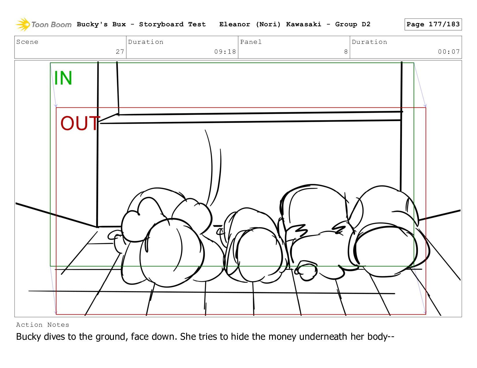 Bucky dives to the ground, face down. She tries to hide the money underneath her body-- Bucky's Bux - Storyboard Test Eleanor (Nori) Kawasaki - Group D2 Page 178/183