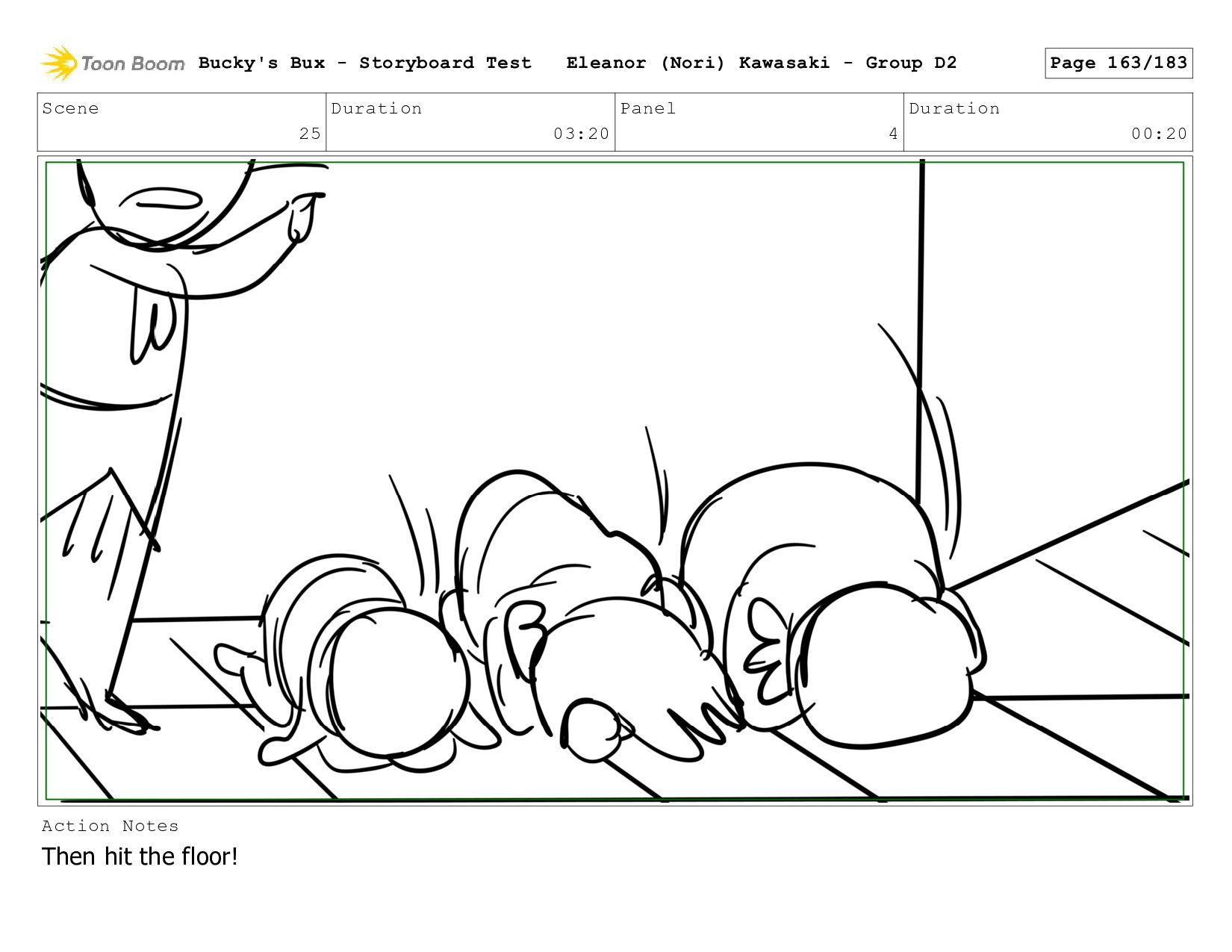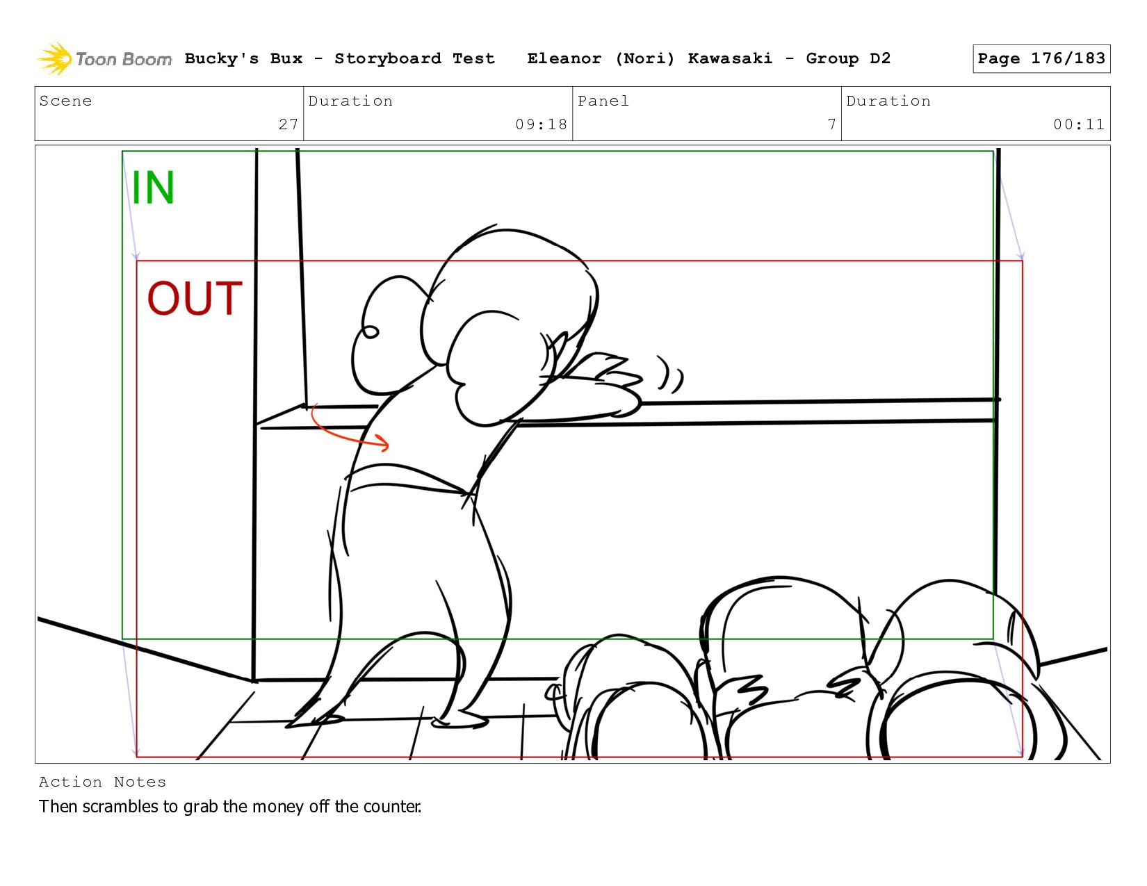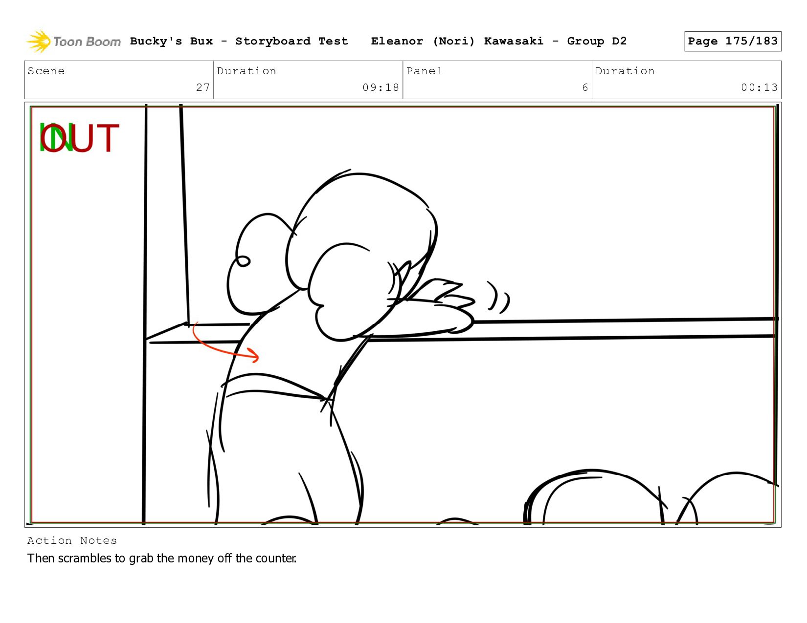 Bucky dives to the ground, face down. She tries to hide the money underneath her body-- Bucky's Bux - Storyboard Test Eleanor (Nori) Kawasaki - Group D2 Page 178/183