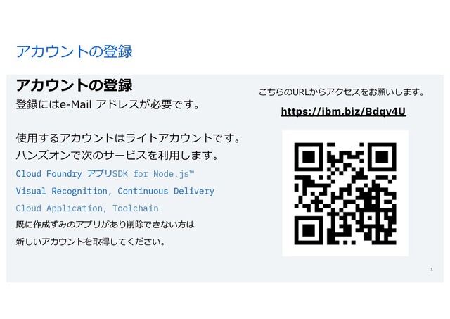 Node.js™ Visual Recognition, Continuous Delivery Cloud Application, Toolchain 既に作成ずみのアプリがあり削除できない⽅は 新しいアカウントを取得してください。 28 こちらのURLからアクセスをお願いします。 https://ibm.biz/Bdqv4U