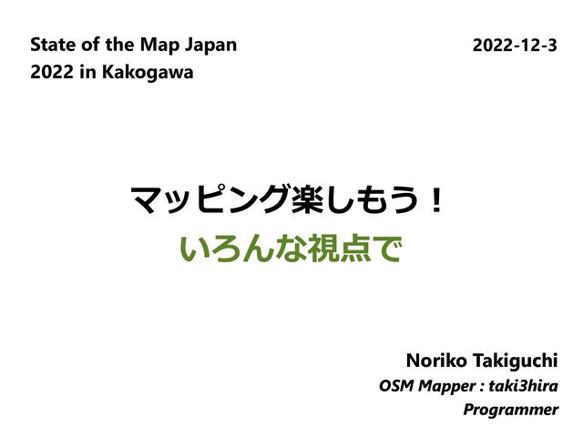 State of the Map Japan 2022 in Kakogawa 2022-12-03 最近のマッピング例から紹介 ・バス停の乗降場所の参照記号のタグ付けについて ・バスルートやトレッキングルートなどリレーションについて ・JupyterLab 環境でのデータ抽出&マップ表示例について~overpy, leafmap 利用
