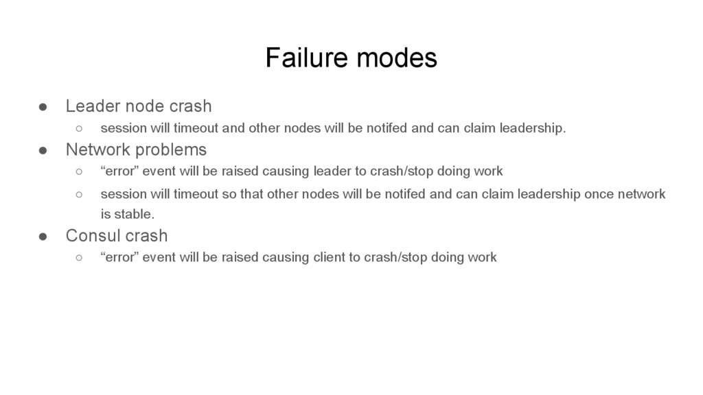and other nodes will be notifed and can claim leadership. • Network problems ◦ “error” event will be raised causing leader to crash/stop doing work ◦ session will timeout so that other nodes will be notifed and can claim leadership once network is stable. • Consul crash ◦ “error” event will be raised causing client to crash/stop doing work