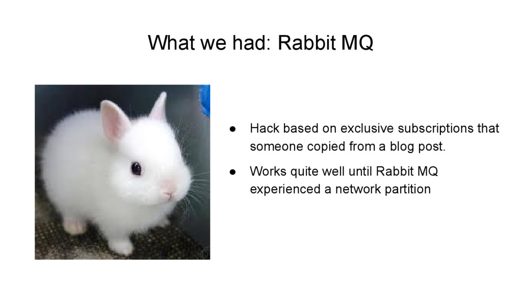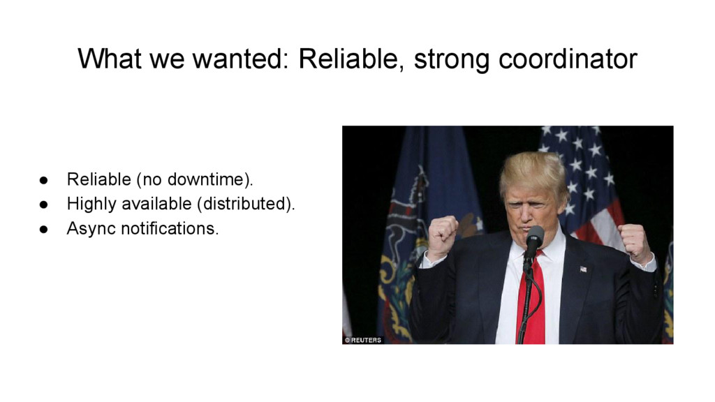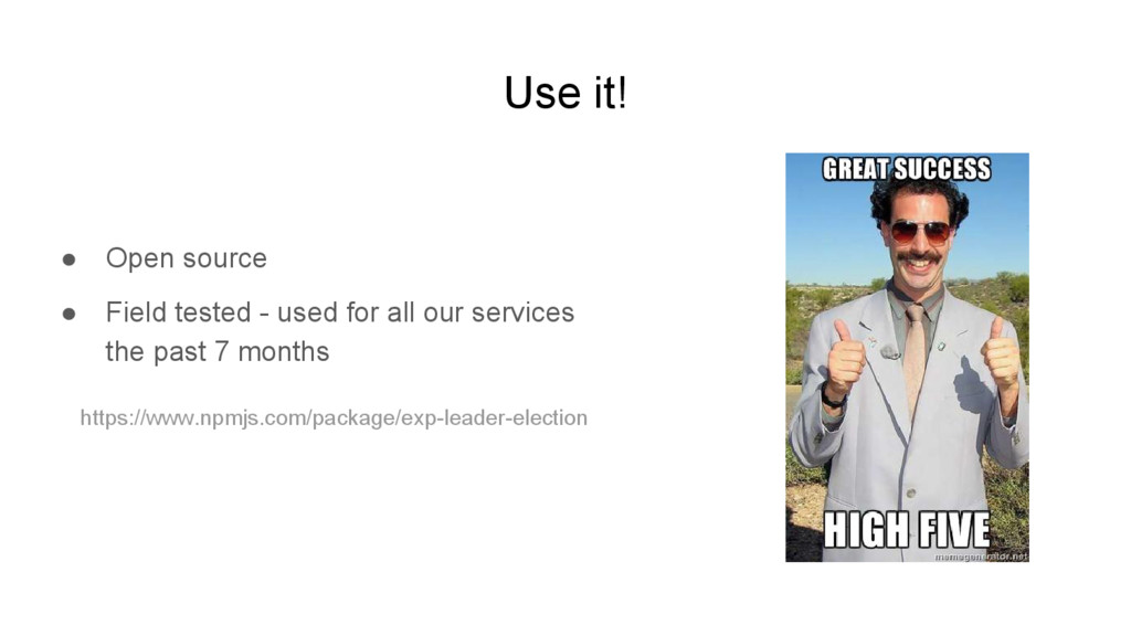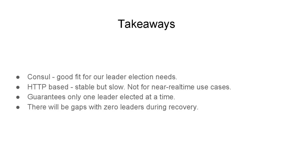 needs. • HTTP based - stable but slow. Not for near-realtime use cases. • Guarantees only one leader elected at a time. • There will be gaps with zero leaders during recovery.