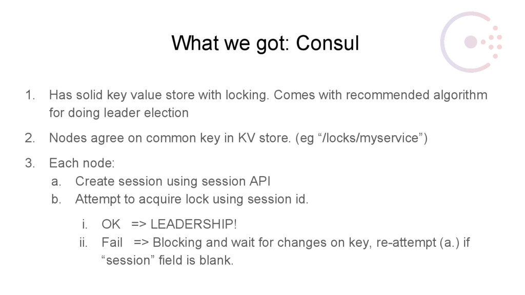 with locking. Comes with recommended algorithm for doing leader election 2. Nodes agree on common key in KV store. (eg “/locks/myservice”) 3. Each node: a. Create session using session API b. Attempt to acquire lock using session id. i. OK => LEADERSHIP! ii. Fail => Blocking and wait for changes on key, re-attempt (a.) if “session” field is blank.