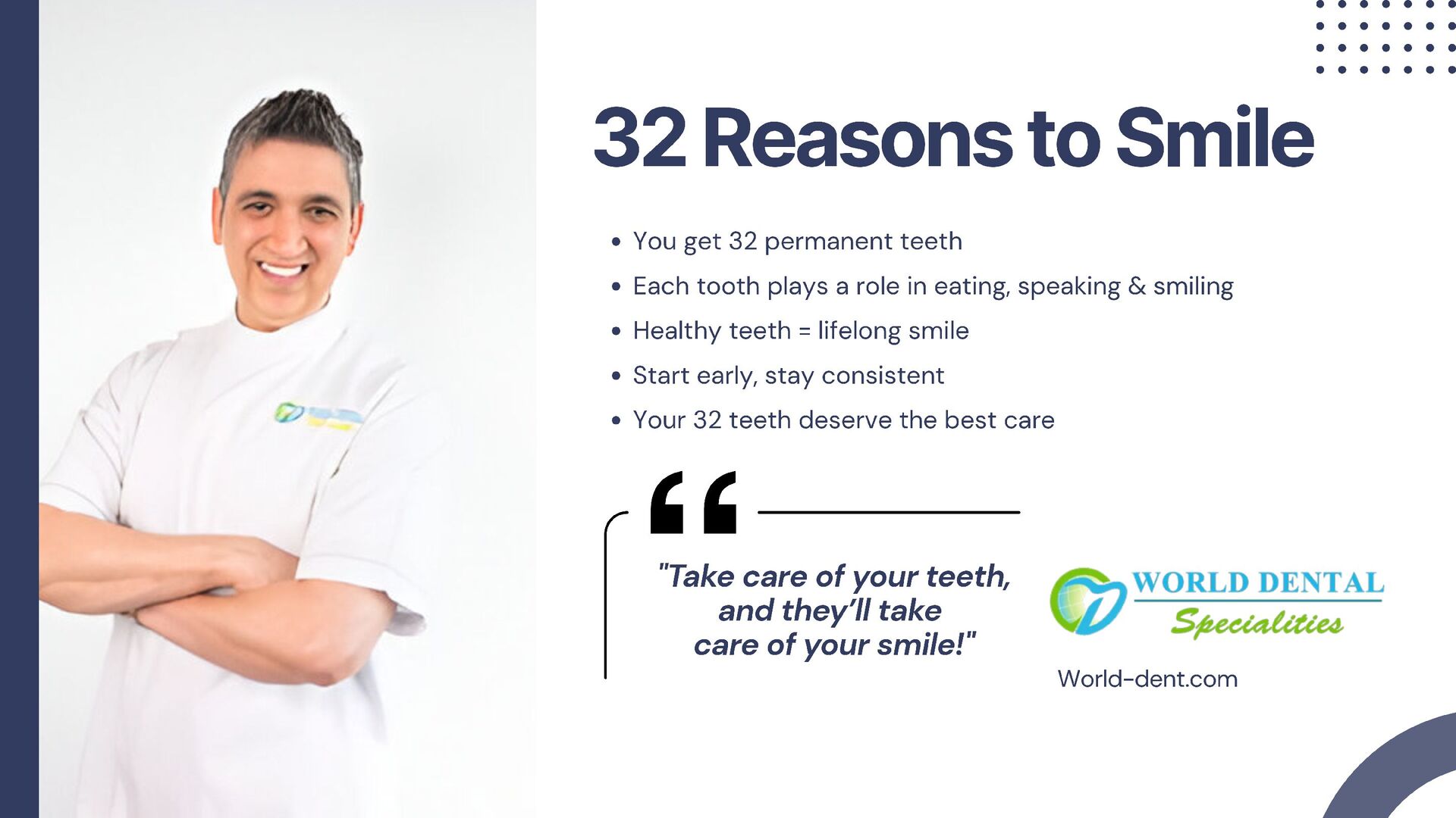 “32 Reasons to Smile” by Dr. Ashdin Turner emphasizes the significance of proper oral hygiene in achieving a radiant smile. Drawing from his expertise as a prosthodontist, Dr. Turner advocates for the use of battery-powered toothbrushes, effective brushing techniques targeting the gum line, regular flossing, and the use of mouthwash to maintain optimal dental health. For more information, visit: www.world-dent.com
