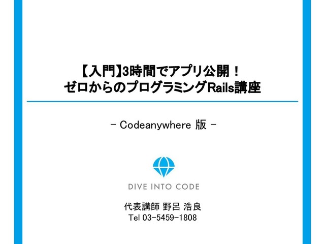 本日のゴール Webアプリケーションをゼロから開発してネット公開までを体 験し、自力で学ぶキッカケを手に入れること。 http://dive-into-code.herokuapp.com/