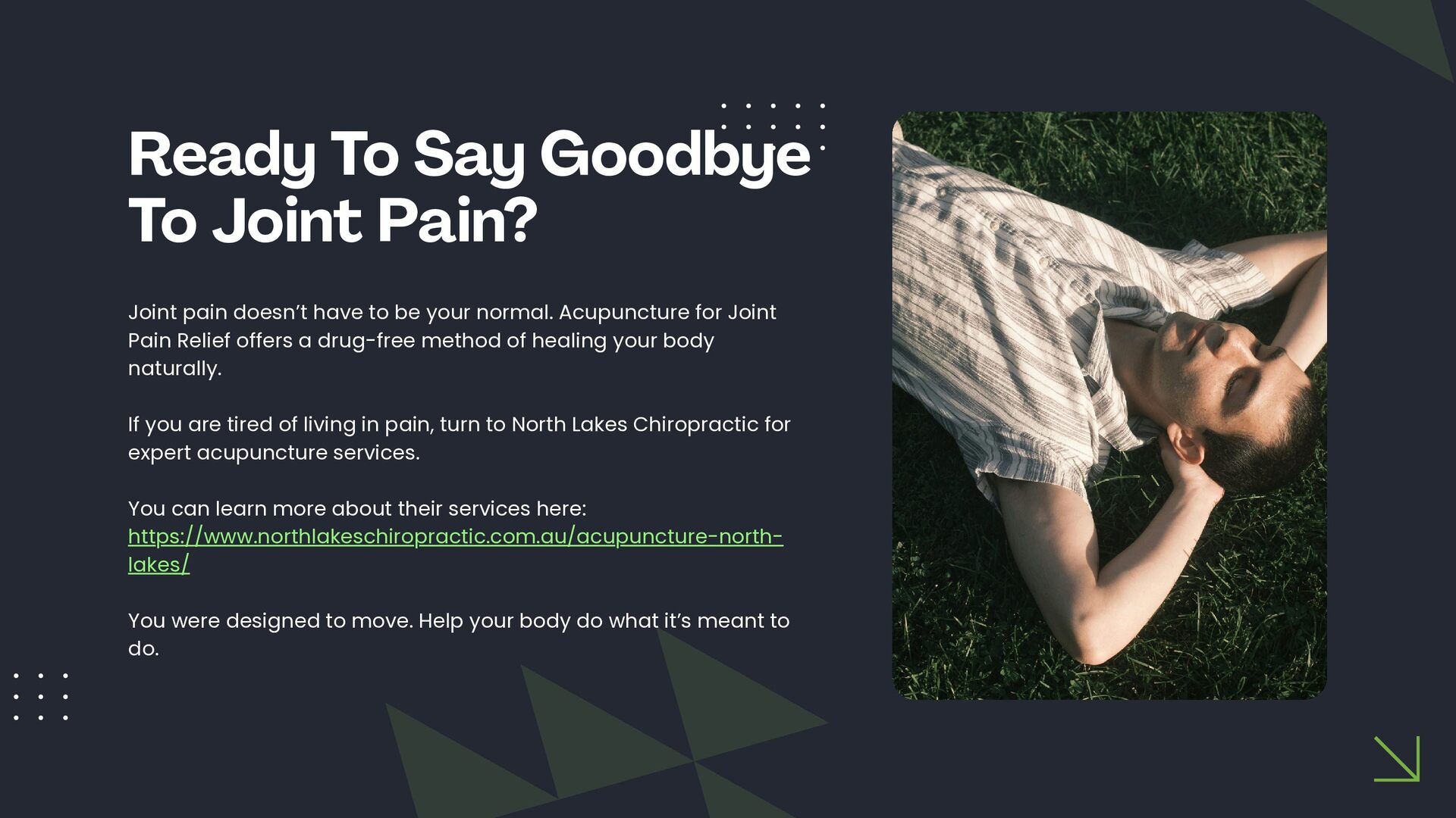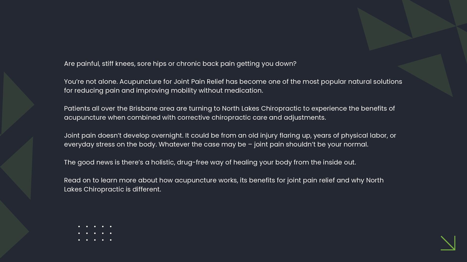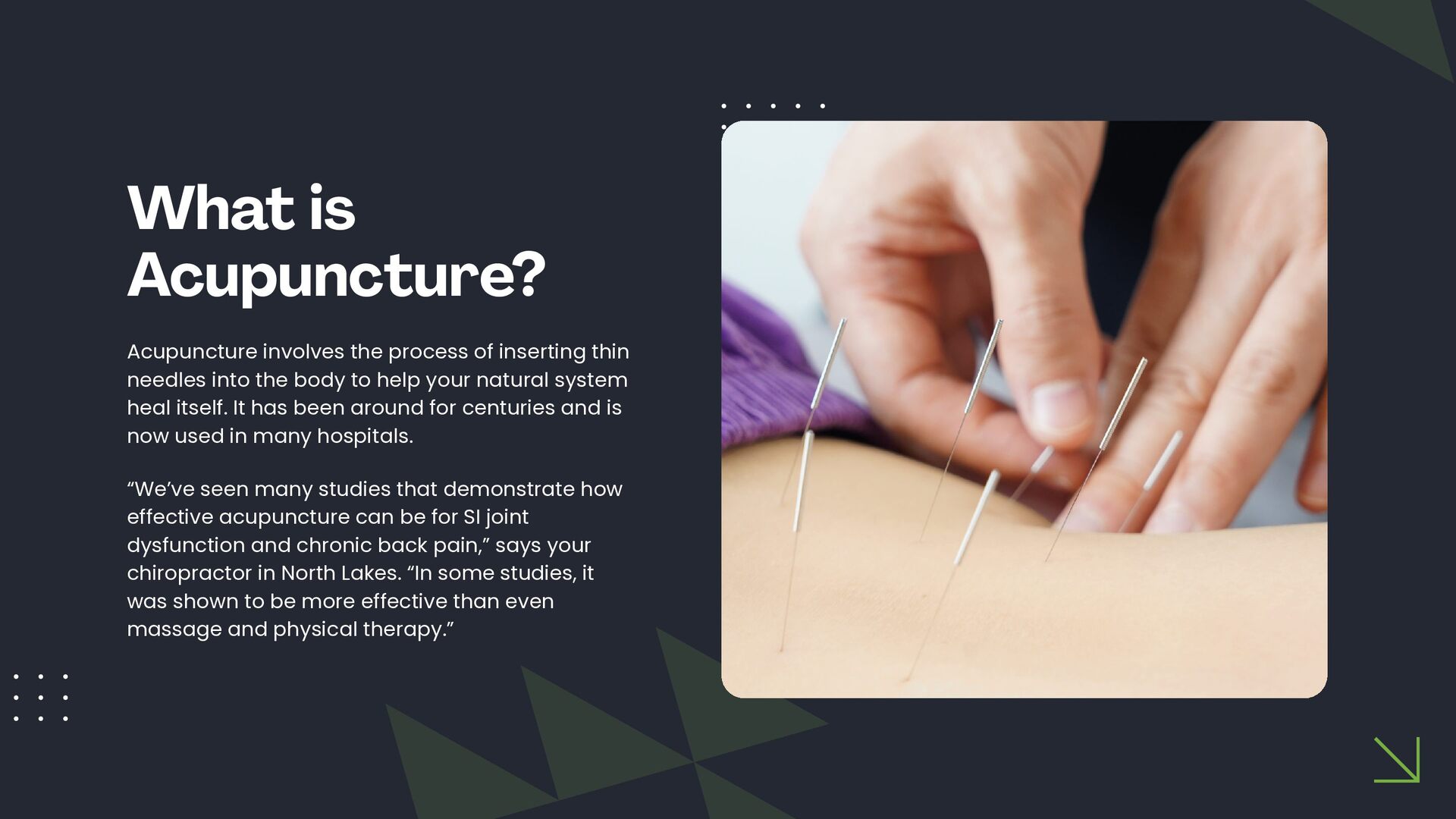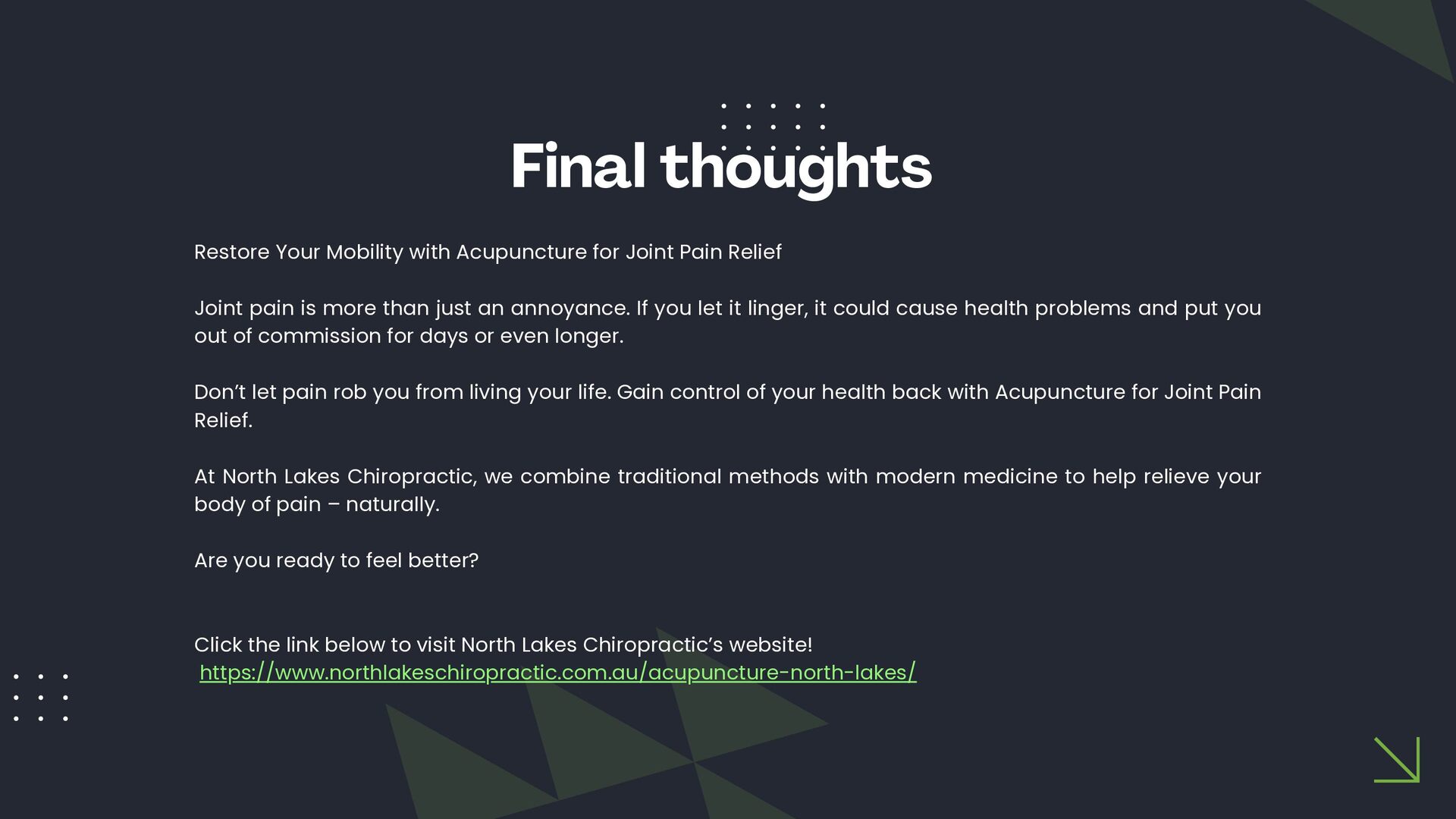 This slide presentation outlines how acupuncture is sometimes used in clinical practice to support joint function and complement chiropractic care. It provides a structured overview of assessment considerations, commonly addressed musculoskeletal presentations, and how techniques such as electro-acupuncture, cupping, guasha, and moxibustion may be incorporated into individualised care plans. The full slide deck is available for viewing at: https://docs.google.com/presentation/d/1WOimlKlraTXGb0Vvb5qWnvsM7imKRj-i/edit?usp=sharing. For more information about tailored treatment options, visit North Lakes Chiropractic in North Lakes, Brisbane via: https://www.northlakeschiropractic.com.au/acupuncture-north-lakes/. Consultations are available to determine whether this approach may be appropriate for your individual needs.
