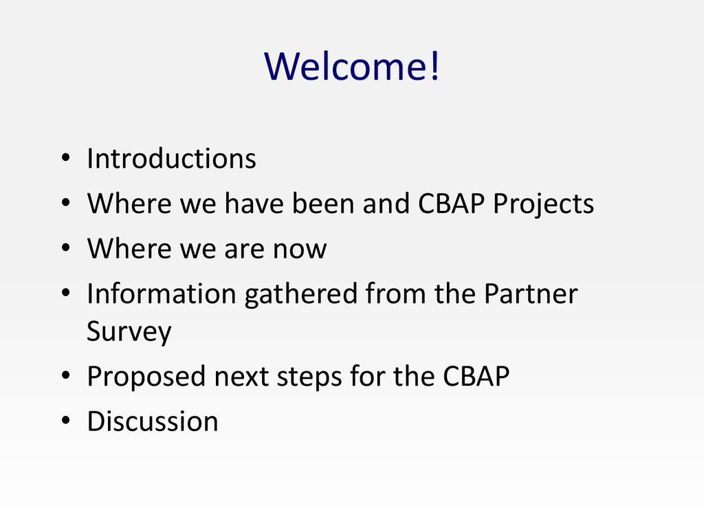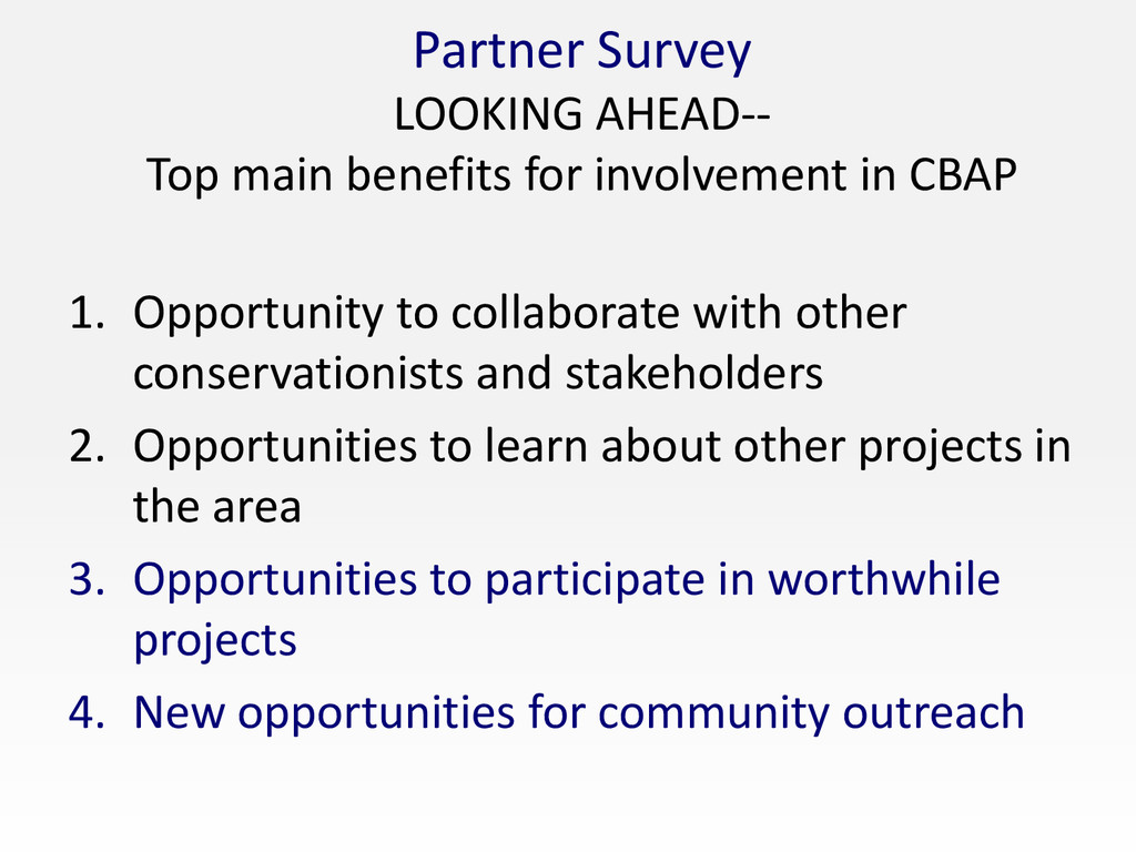 CBAP 1. Opportunity to collaborate with other conservationists and stakeholders 2. Opportunities to learn about other projects in the area 3. Opportunities to participate in worthwhile projects 4. New opportunities for community outreach
