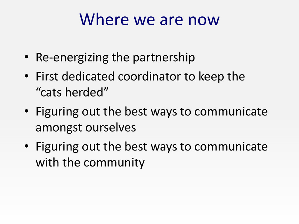 dedicated coordinator to keep the “cats herded” • Figuring out the best ways to communicate amongst ourselves • Figuring out the best ways to communicate with the community
