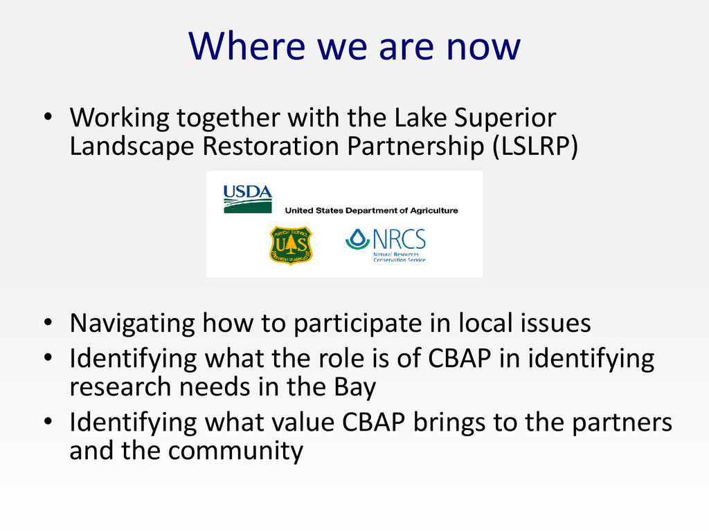 Superior Landscape Restoration Partnership (LSLRP) • Navigating how to participate in local issues • Identifying what the role is of CBAP in identifying research needs in the Bay • Identifying what value CBAP brings to the partners and the community