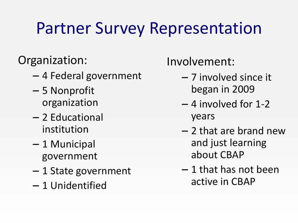 Nonprofit organization – 2 Educational institution – 1 Municipal government – 1 State government – 1 Unidentified Involvement: – 7 involved since it began in 2009 – 4 involved for 1-2 years – 2 that are brand new and just learning about CBAP – 1 that has not been active in CBAP