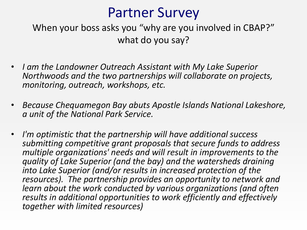 involved in CBAP?” what do you say? • I am the Landowner Outreach Assistant with My Lake Superior Northwoods and the two partnerships will collaborate on projects, monitoring, outreach, workshops, etc. • Because Chequamegon Bay abuts Apostle Islands National Lakeshore, a unit of the National Park Service. • I'm optimistic that the partnership will have additional success submitting competitive grant proposals that secure funds to address multiple organizations' needs and will result in improvements to the quality of Lake Superior (and the bay) and the watersheds draining into Lake Superior (and/or results in increased protection of the resources). The partnership provides an opportunity to network and learn about the work conducted by various organizations (and often results in additional opportunities to work efficiently and effectively together with limited resources)