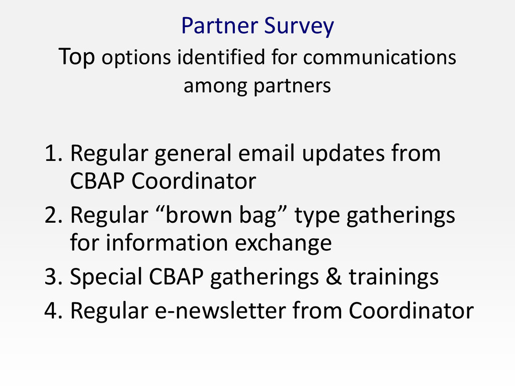 Regular general email updates from CBAP Coordinator 2. Regular “brown bag” type gatherings for information exchange 3. Special CBAP gatherings & trainings 4. Regular e-newsletter from Coordinator