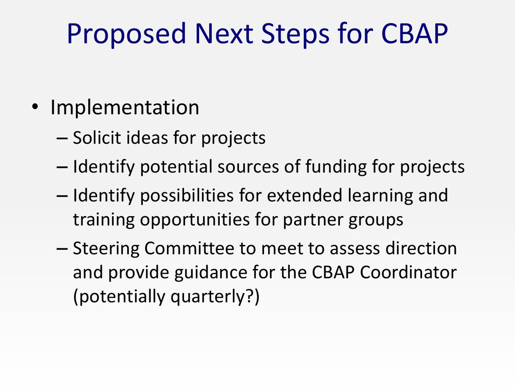 for projects – Identify potential sources of funding for projects – Identify possibilities for extended learning and training opportunities for partner groups – Steering Committee to meet to assess direction and provide guidance for the CBAP Coordinator (potentially quarterly?)
