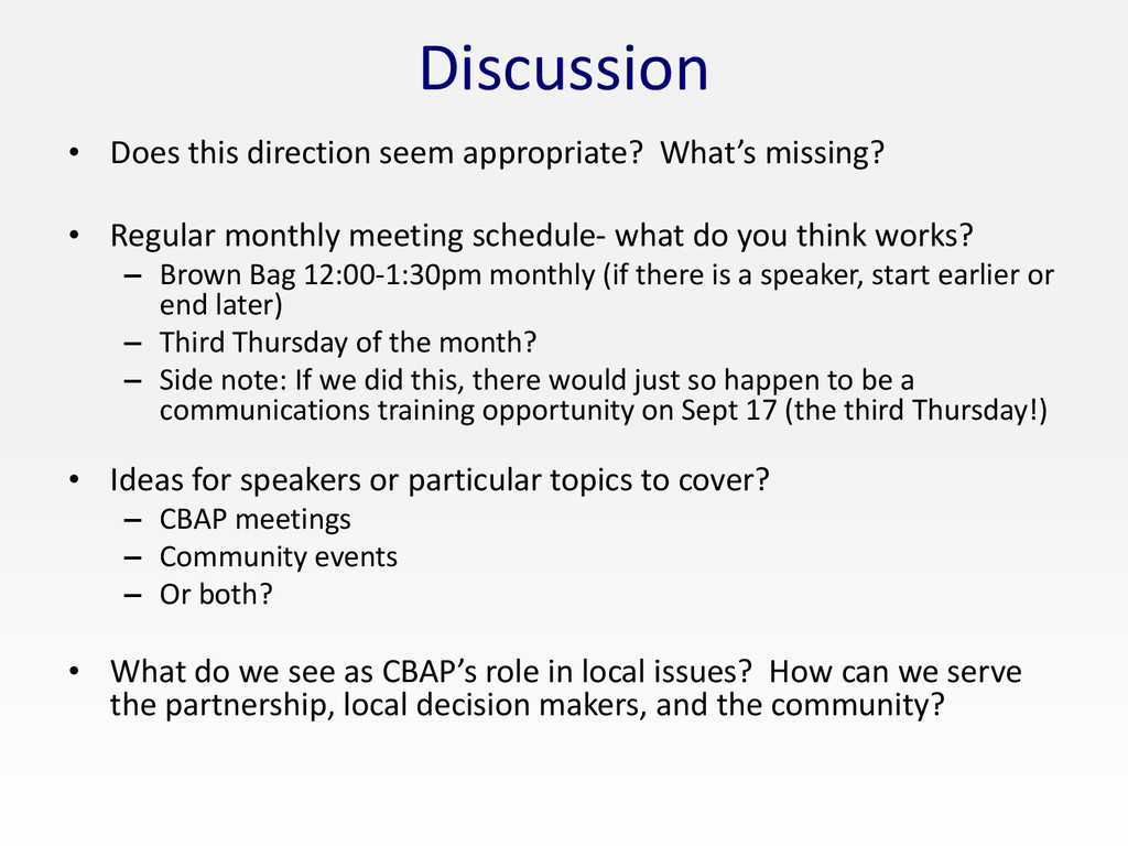 Regular monthly meeting schedule- what do you think works? – Brown Bag 12:00-1:30pm monthly (if there is a speaker, start earlier or end later) – Third Thursday of the month? – Side note: If we did this, there would just so happen to be a communications training opportunity on Sept 17 (the third Thursday!) • Ideas for speakers or particular topics to cover? – CBAP meetings – Community events – Or both? • What do we see as CBAP’s role in local issues? How can we serve the partnership, local decision makers, and the community?