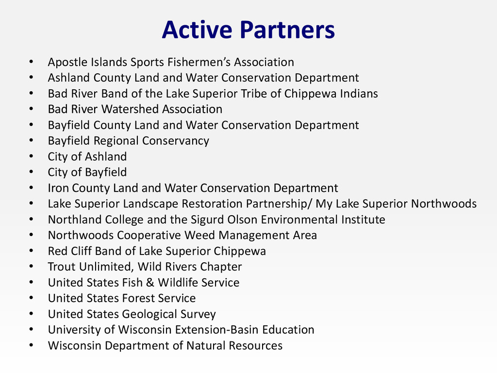 County Land and Water Conservation Department • Bad River Band of the Lake Superior Tribe of Chippewa Indians • Bad River Watershed Association • Bayfield County Land and Water Conservation Department • Bayfield Regional Conservancy • City of Ashland • City of Bayfield • Iron County Land and Water Conservation Department • Lake Superior Landscape Restoration Partnership/ My Lake Superior Northwoods • Northland College and the Sigurd Olson Environmental Institute • Northwoods Cooperative Weed Management Area • Red Cliff Band of Lake Superior Chippewa • Trout Unlimited, Wild Rivers Chapter • United States Fish & Wildlife Service • United States Forest Service • United States Geological Survey • University of Wisconsin Extension-Basin Education • Wisconsin Department of Natural Resources