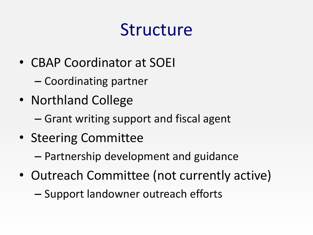 Northland College – Grant writing support and fiscal agent • Steering Committee – Partnership development and guidance • Outreach Committee (not currently active) – Support landowner outreach efforts