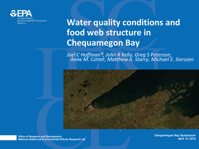 can be masked by a collage strip of one, two or three images. The photo image area is located 3.19” from left and 3.81” from top of page. Each image used in collage should be reduced or cropped to a maximum of 2” high, stroked with a 1.5 pt white frame and positioned edge-to-edge with accompanying images. Joel C Hoffman*, John R Kelly, Greg S Peterson, Anne M. Cotter, Matthew A. Starry, Michael E. Sierszen Water quality conditions and food web structure in Chequamegon Bay Office of Research and Development National Health and Environmental Effects Research Lab Chequamegon Bay Symposium April 14, 2015