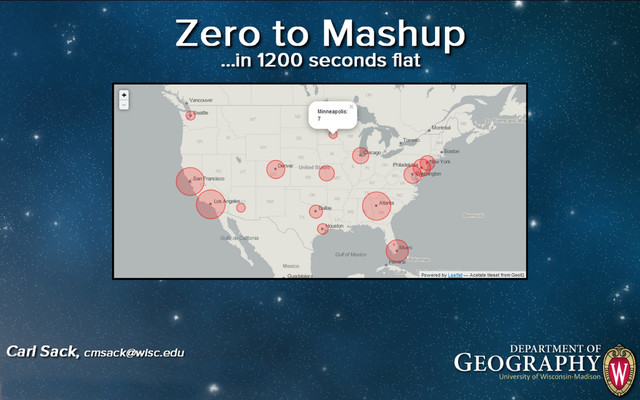 Got some data? Want to make an interactive web map? Sure, you can rely on some point-and-click application for an automatic (and sub-optimal) solution--but what fun is that? No, you're here because you are a do-it-yourselfer who wants to know how to get the most design flexibility and make the coolest possible mash-up. This session will get you going with a lightning start-to-finish example using the open-source Leaflet mapping library that knocks the GUIs out of the game.