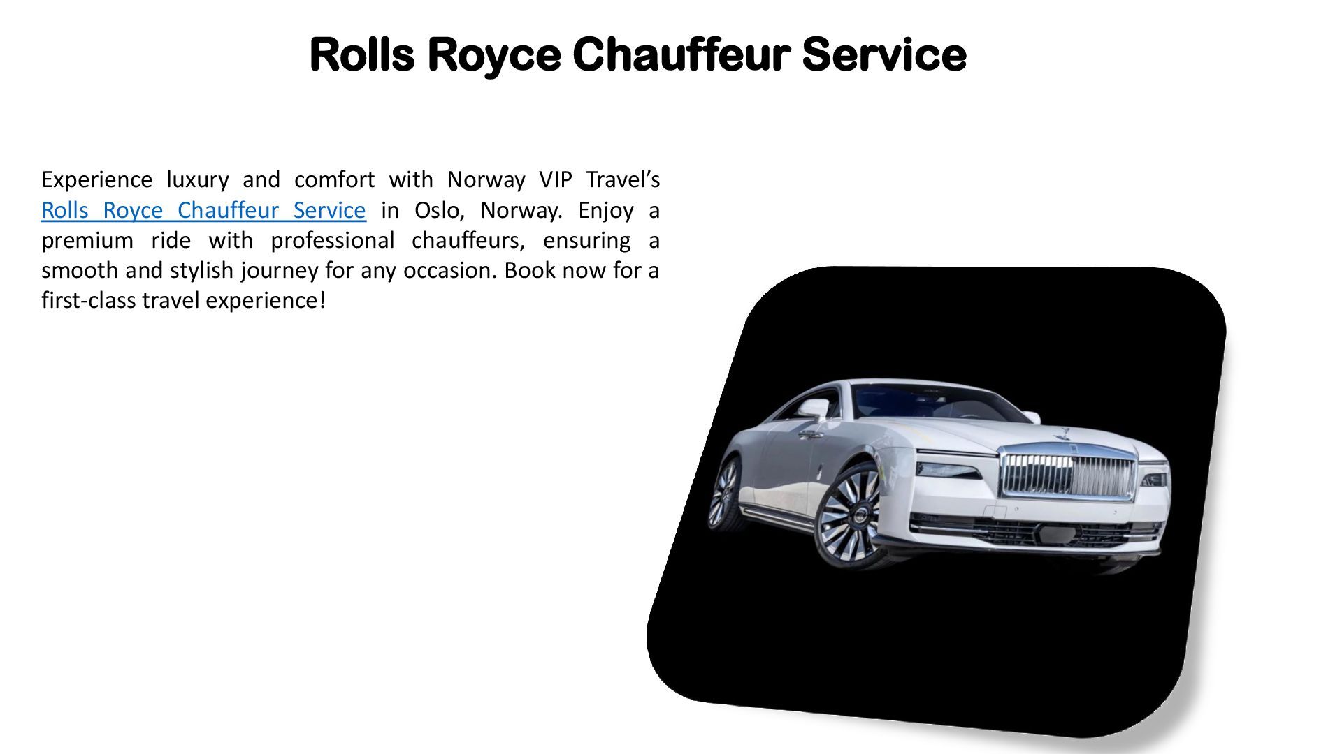 Experience luxury and comfort with Norway VIP Travel’s Rolls Royce Chauffeur Service in Oslo, Norway. Enjoy a premium ride with professional chauffeurs, ensuring a smooth and stylish journey for any occasion. Book now for a first-class travel experience!
