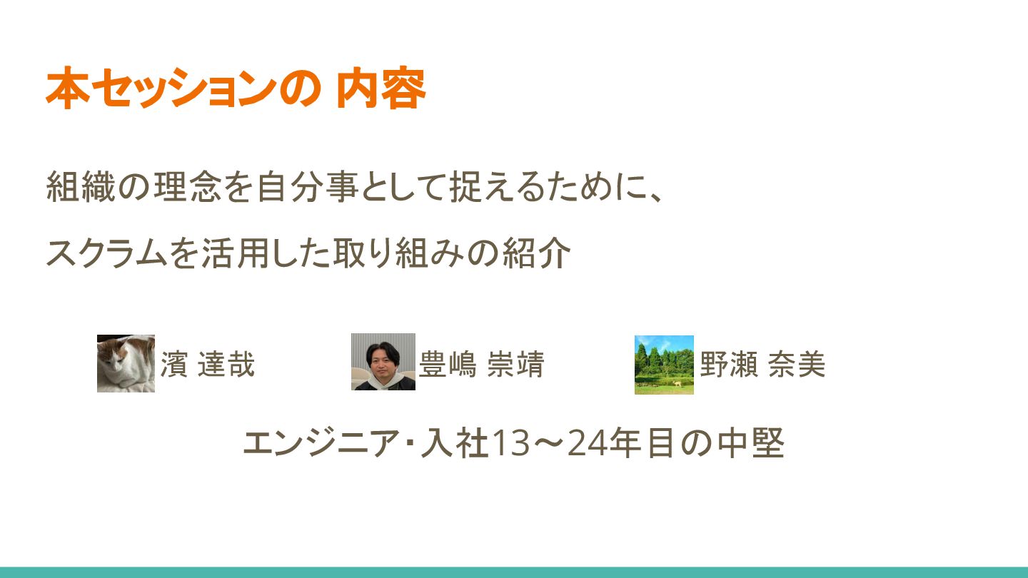 本セッションでは、組織の理念を自分事として捉えるために、スクラムを活用した取り組みを実体験としてお伝えします。組織の課題に取り組んでいる方の参考になれば幸いです。
