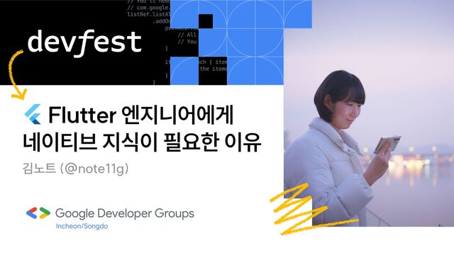 유지보수에 소요되는 비용을 최소화할 수 있다 (Dart로 높은 추상화) Flutter의 장점 웬만하면 다 된다 성능도 준수하다 Android / iOS를 알아야 하는 때 “웬만하면 다 된다”가 안 될 때 네이티브 코드로 구축된 패키지(라이브러리)의 이슈를 내가 수정해야 할 때 네이티브에서만 지원하는 기능/라이브러리를 사용해야 할 때 성능이 부족할 때 (하드웨어 가속, MultiThreading)