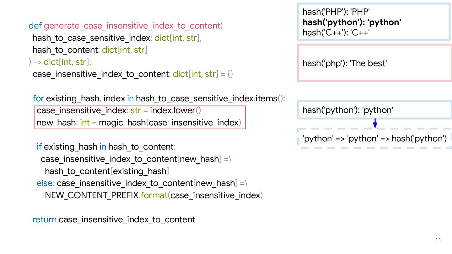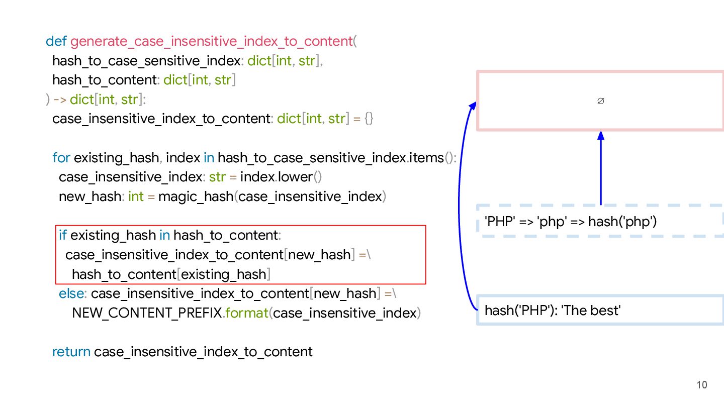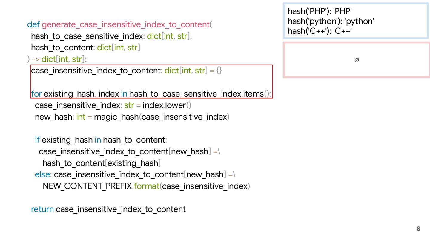 -> dict[int, str]: case_insensitive_index_to_content: dict[int, str] = {} for existing_hash, index in hash_to_case_sensitive_index.items(): case_insensitive_index: str = index.lower() new_hash: int = magic_hash(case_insensitive_index) if existing_hash in hash_to_content: case_insensitive_index_to_content[new_hash] =\ hash_to_content[existing_hash] else: case_insensitive_index_to_content[new_hash] =\ NEW_CONTENT_PREFIX.format(case_insensitive_index) return case_insensitive_index_to_content hash('python'): 'Better than the best' hash('php'): 'The best' hash('python'): 'python'