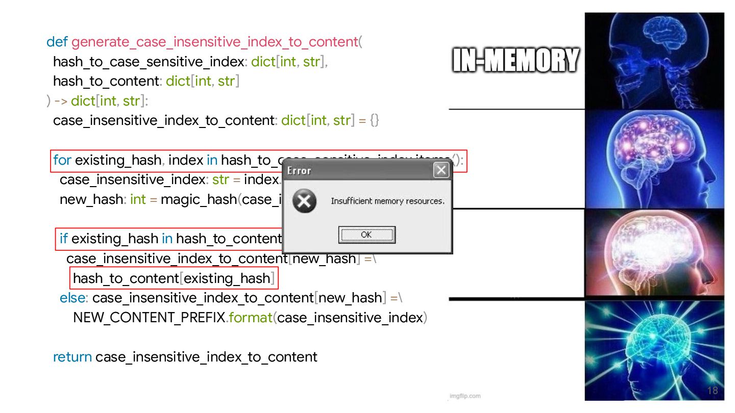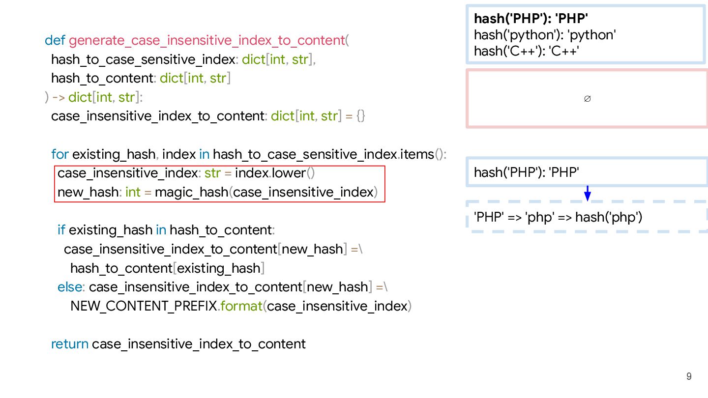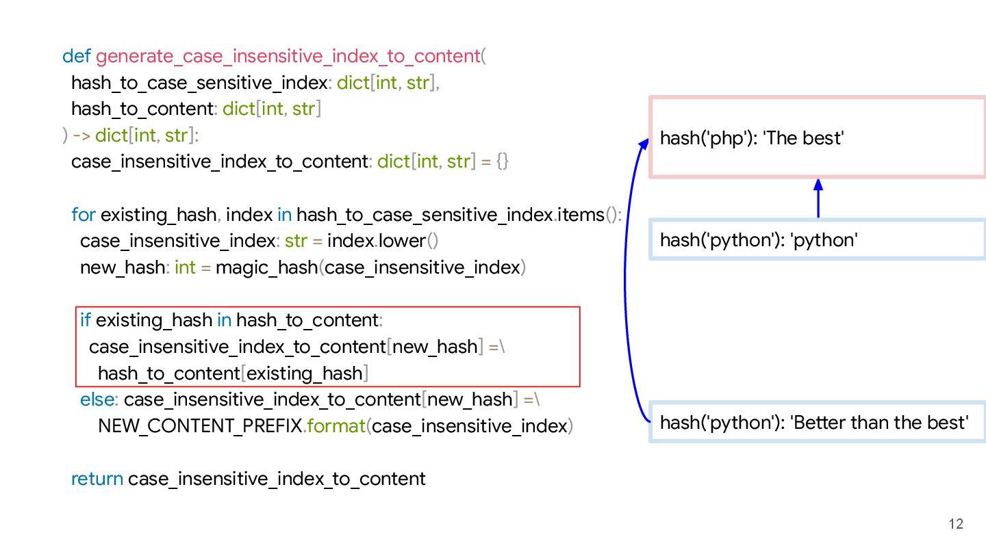 -> dict[int, str]: case_insensitive_index_to_content: dict[int, str] = {} for existing_hash, index in hash_to_case_sensitive_index.items(): case_insensitive_index: str = index.lower() new_hash: int = magic_hash(case_insensitive_index) if existing_hash in hash_to_content: case_insensitive_index_to_content[new_hash] =\ hash_to_content[existing_hash] else: case_insensitive_index_to_content[new_hash] =\ NEW_CONTENT_PREFIX.format(case_insensitive_index) return case_insensitive_index_to_content hash('python'): 'Better than the best' hash('php'): 'The best' hash('python'): 'python'