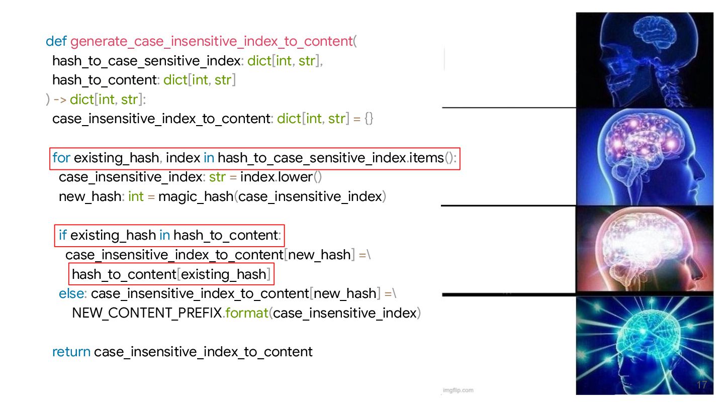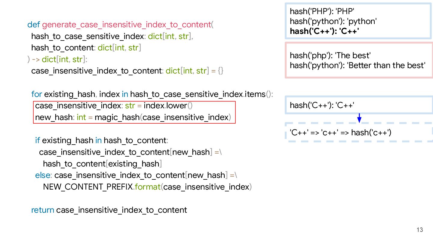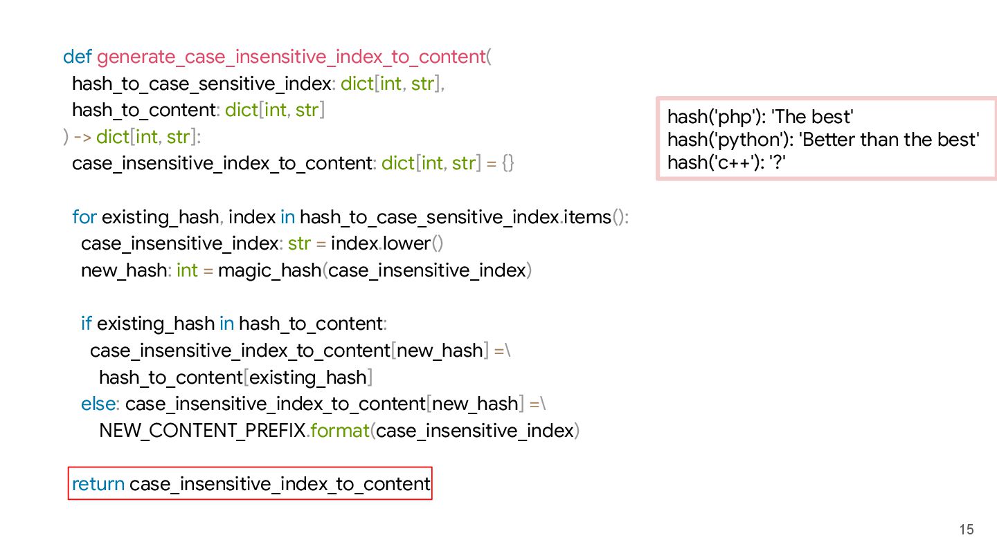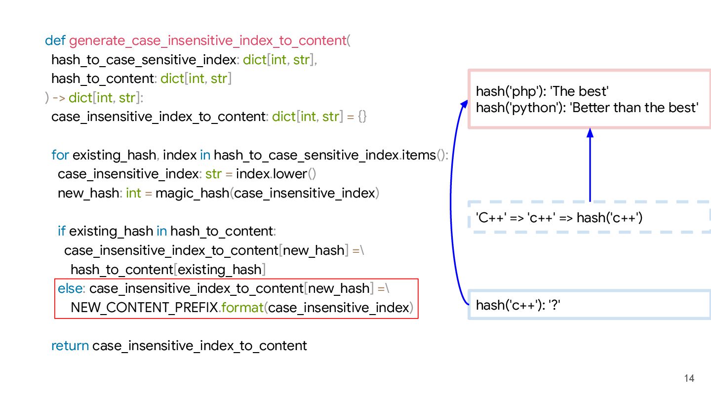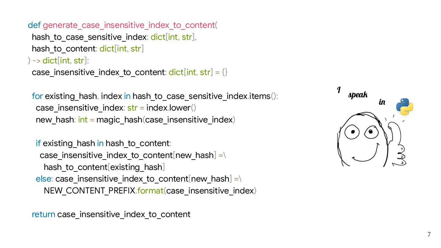-> dict[int, str]: case_insensitive_index_to_content: dict[int, str] = {} for existing_hash, index in hash_to_case_sensitive_index.items(): case_insensitive_index: str = index.lower() new_hash: int = magic_hash(case_insensitive_index) if existing_hash in hash_to_content: case_insensitive_index_to_content[new_hash] =\ hash_to_content[existing_hash] else: case_insensitive_index_to_content[new_hash] =\ NEW_CONTENT_PREFIX.format(case_insensitive_index) return case_insensitive_index_to_content hash('php'): 'The best' hash('python'): 'Better than the best' hash('c++'): '?'