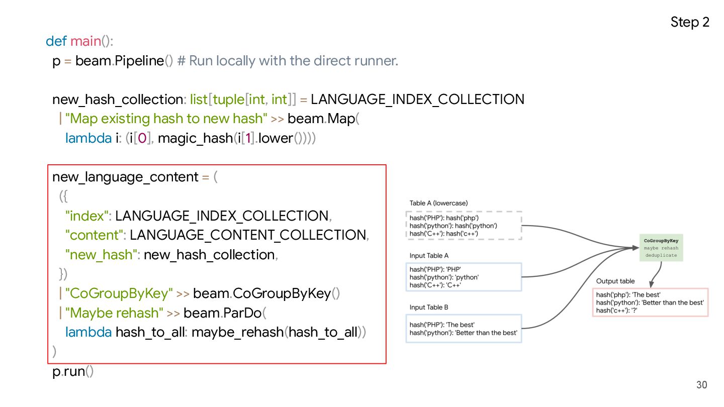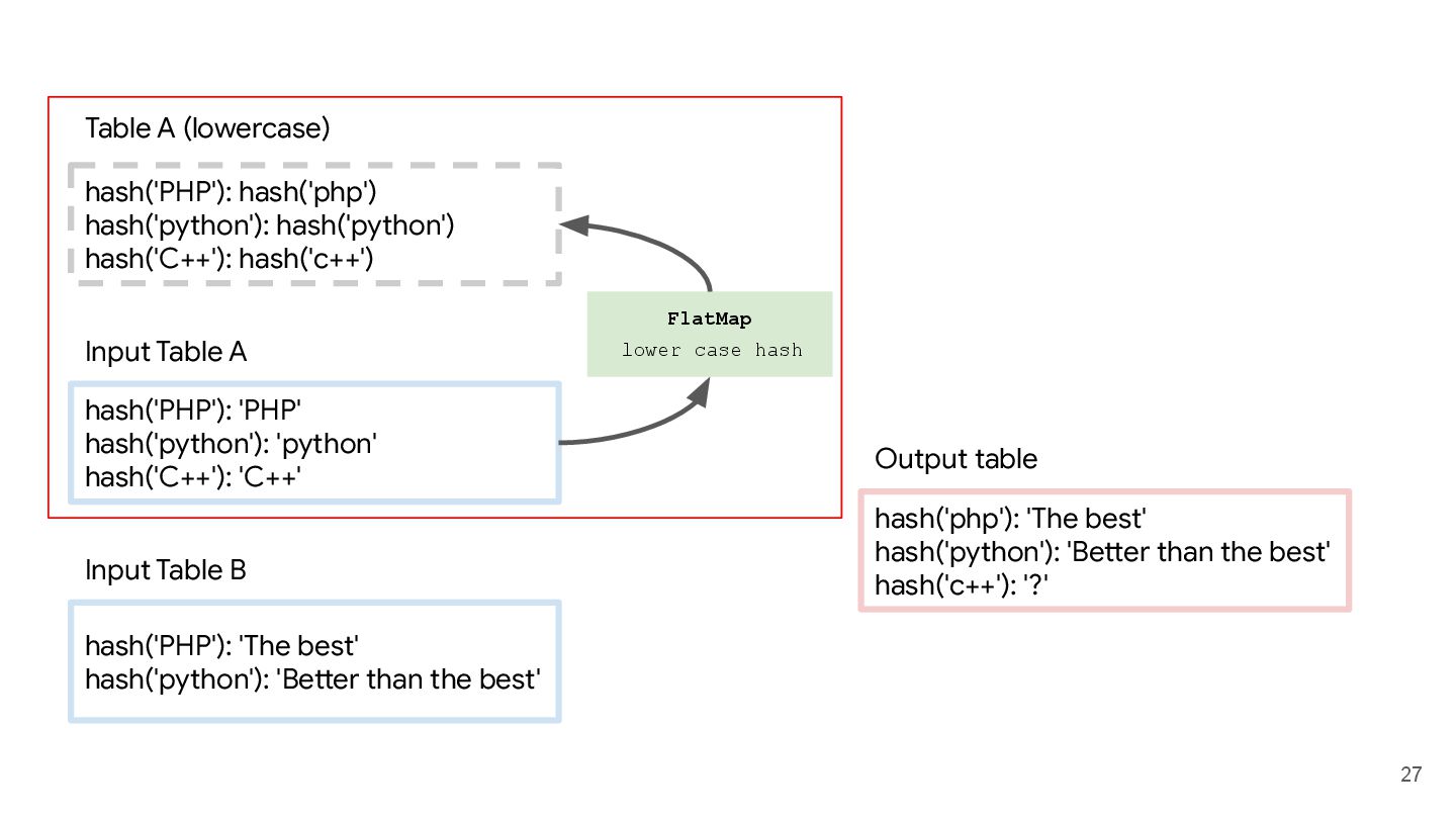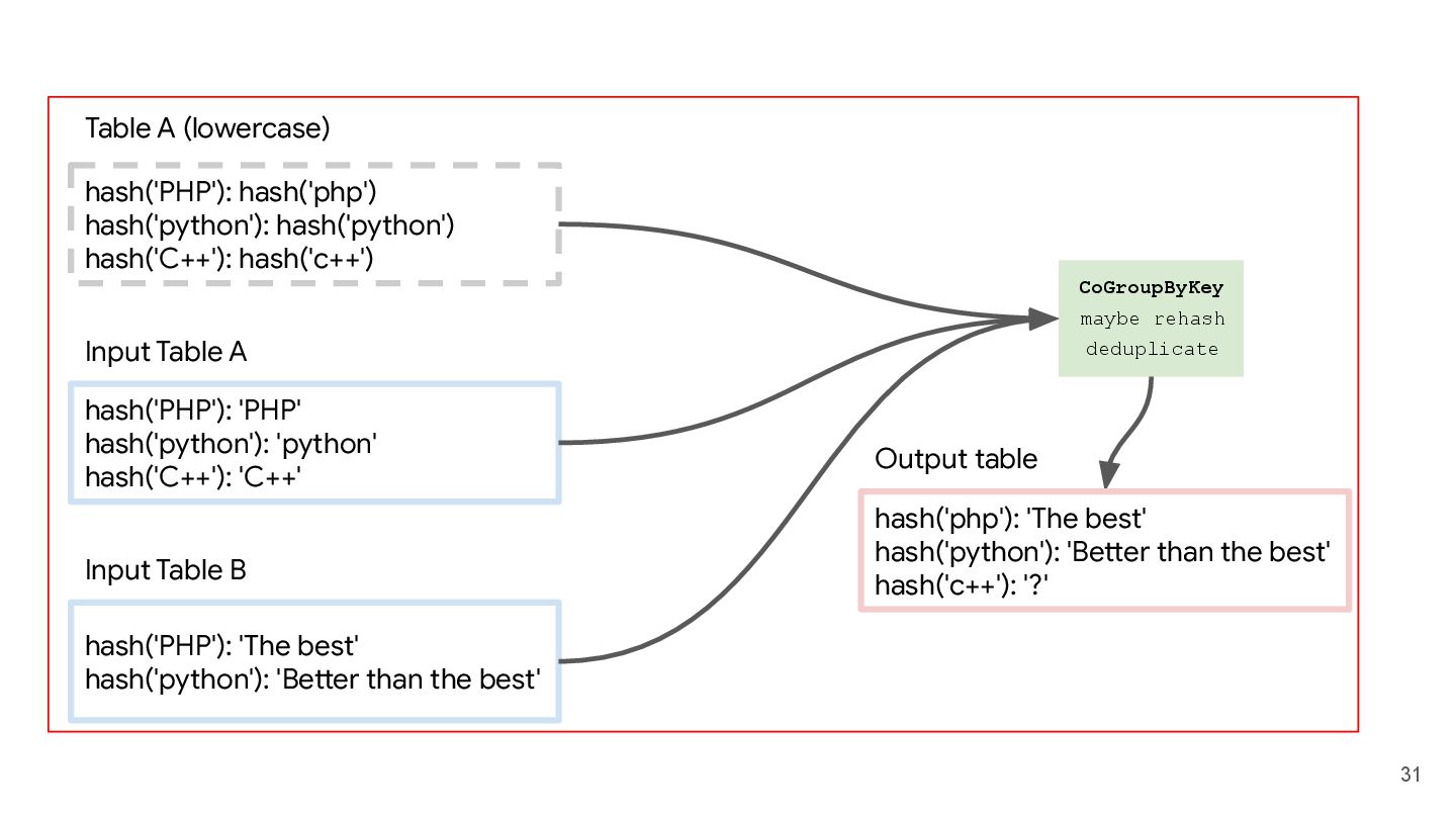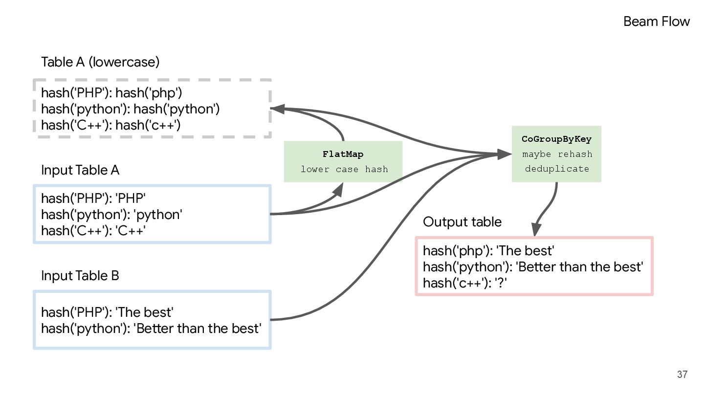 hash('c++') Table A (lowercase) hash('PHP'): 'PHP' hash('python'): 'python' hash('C++'): 'C++' Input Table A hash('PHP'): 'The best' hash('python'): 'Better than the best' Input Table B CoGroupByKey maybe rehash deduplicate hash('php'): 'The best' hash('python'): 'Better than the best' hash('c++'): '?' Output table Beam Flow