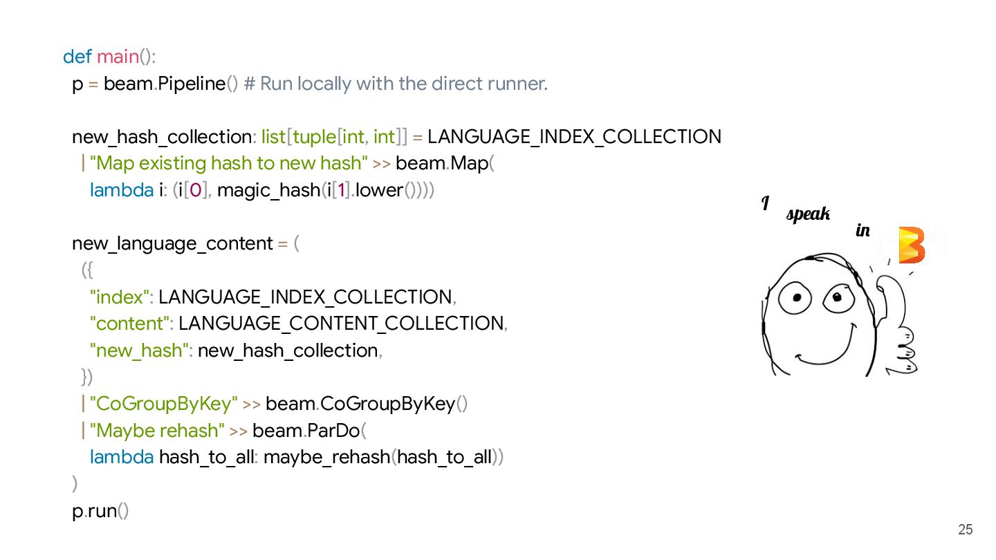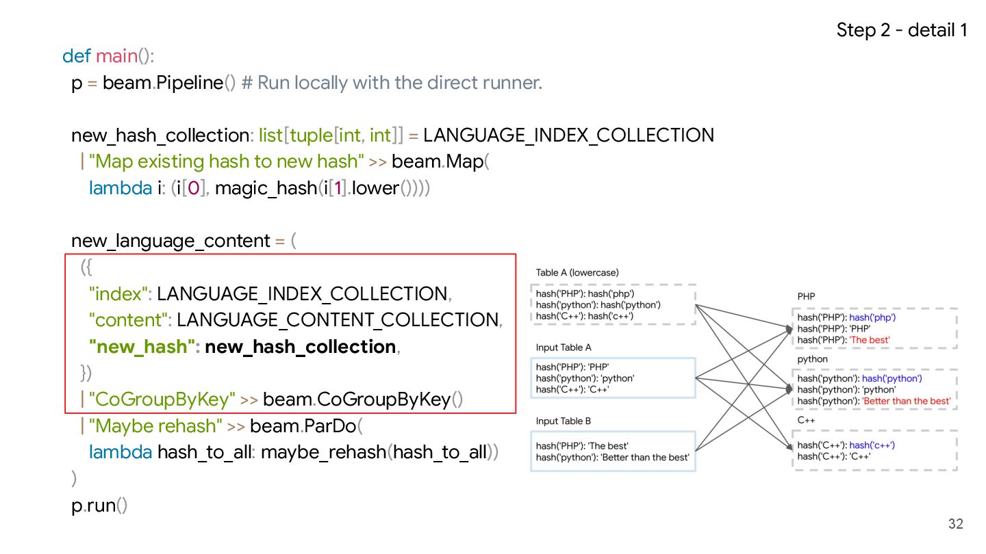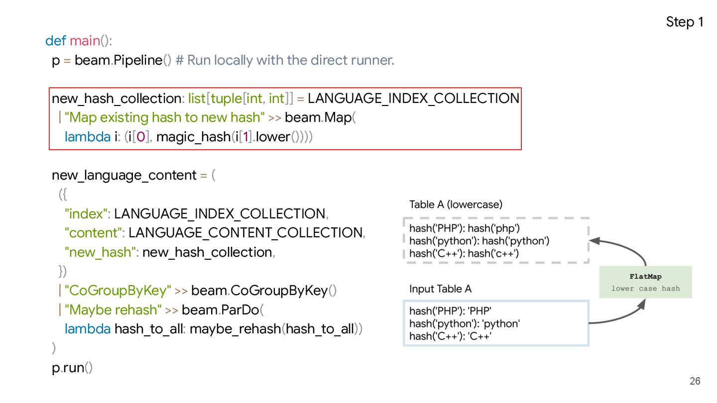 hash('c++') Table A (lowercase) hash('PHP'): 'PHP' hash('python'): 'python' hash('C++'): 'C++' Input Table A hash('PHP'): 'The best' hash('python'): 'Better than the best' Input Table B CoGroupByKey maybe rehash deduplicate hash('php'): 'The best' hash('python'): 'Better than the best' hash('c++'): '?' Output table Beam Flow