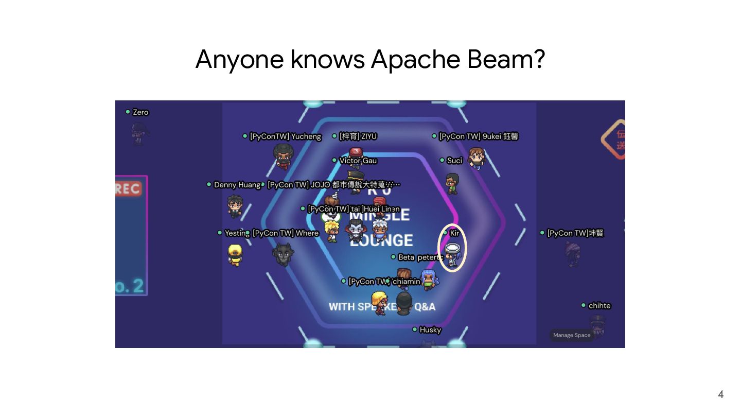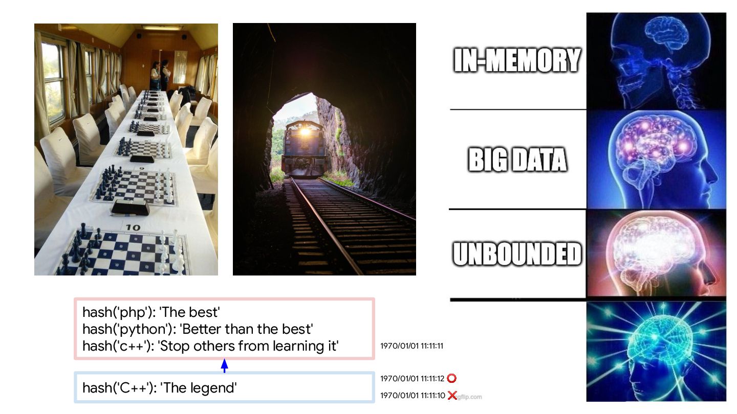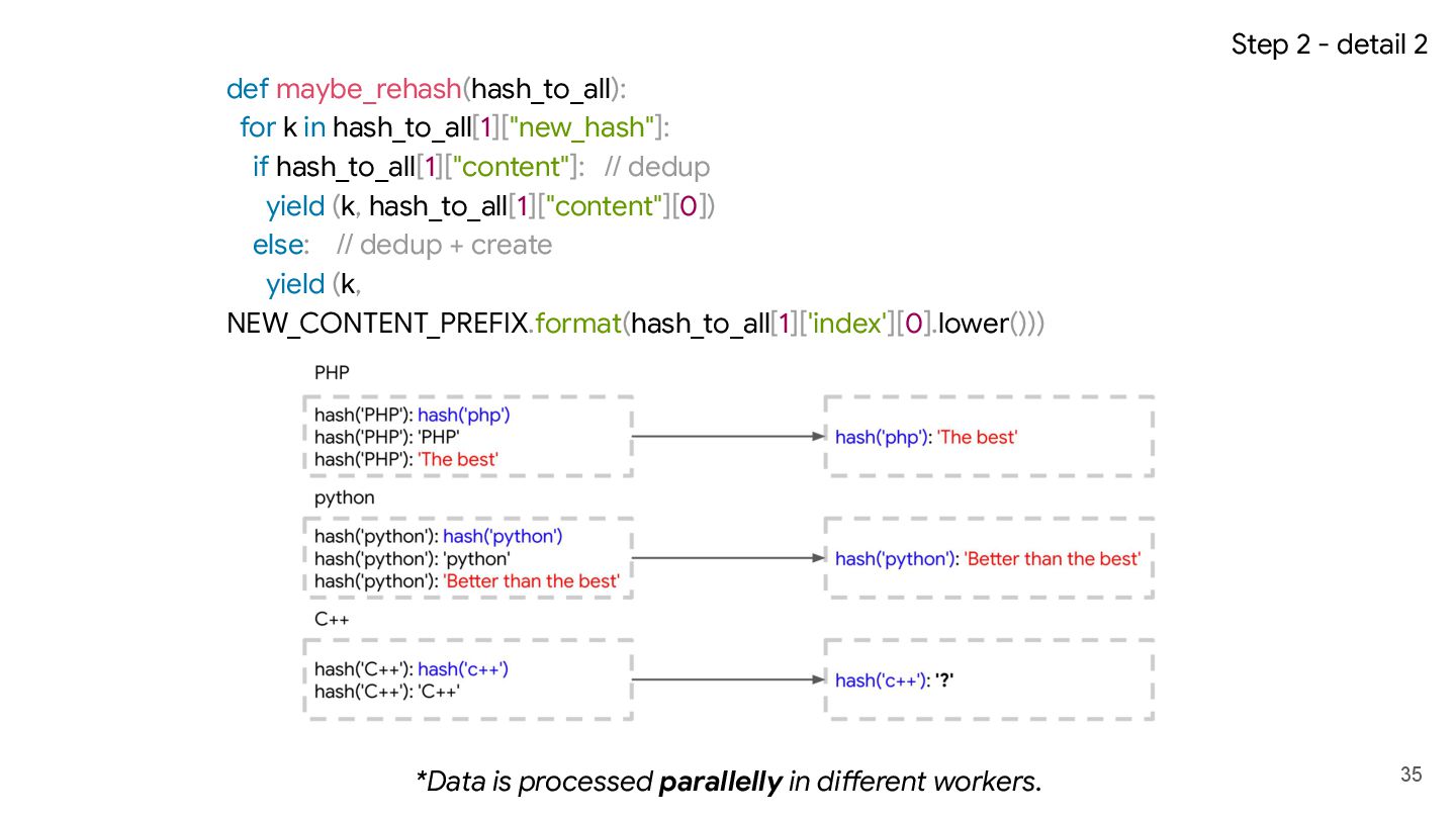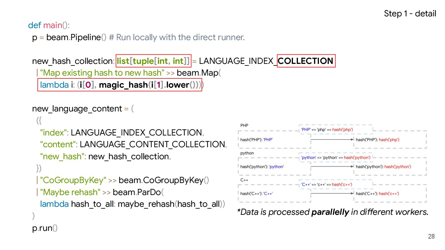 hash('c++') Table A (lowercase) hash('PHP'): 'PHP' hash('python'): 'python' hash('C++'): 'C++' Input Table A hash('PHP'): 'The best' hash('python'): 'Better than the best' Input Table B CoGroupByKey maybe rehash deduplicate hash('php'): 'The best' hash('python'): 'Better than the best' hash('c++'): '?' Output table Beam Flow