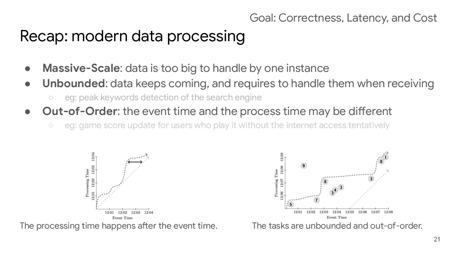 to handle by one instance • Unbounded: data keeps coming, and requires to handle them when receiving ◦ eg: peak keywords detection of the search engine • Out-of-Order: the event time and the process time may be different ◦ eg: game score update for users who play it without the internet access tentatively The processing time happens after the event time. The tasks are unbounded and out-of-order. 21 Goal: Correctness, Latency, and Cost