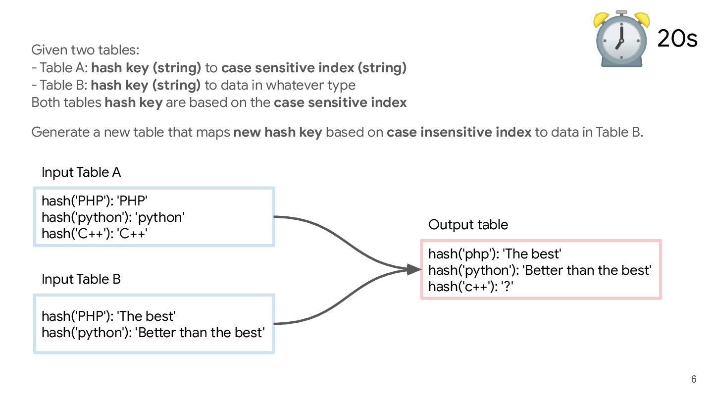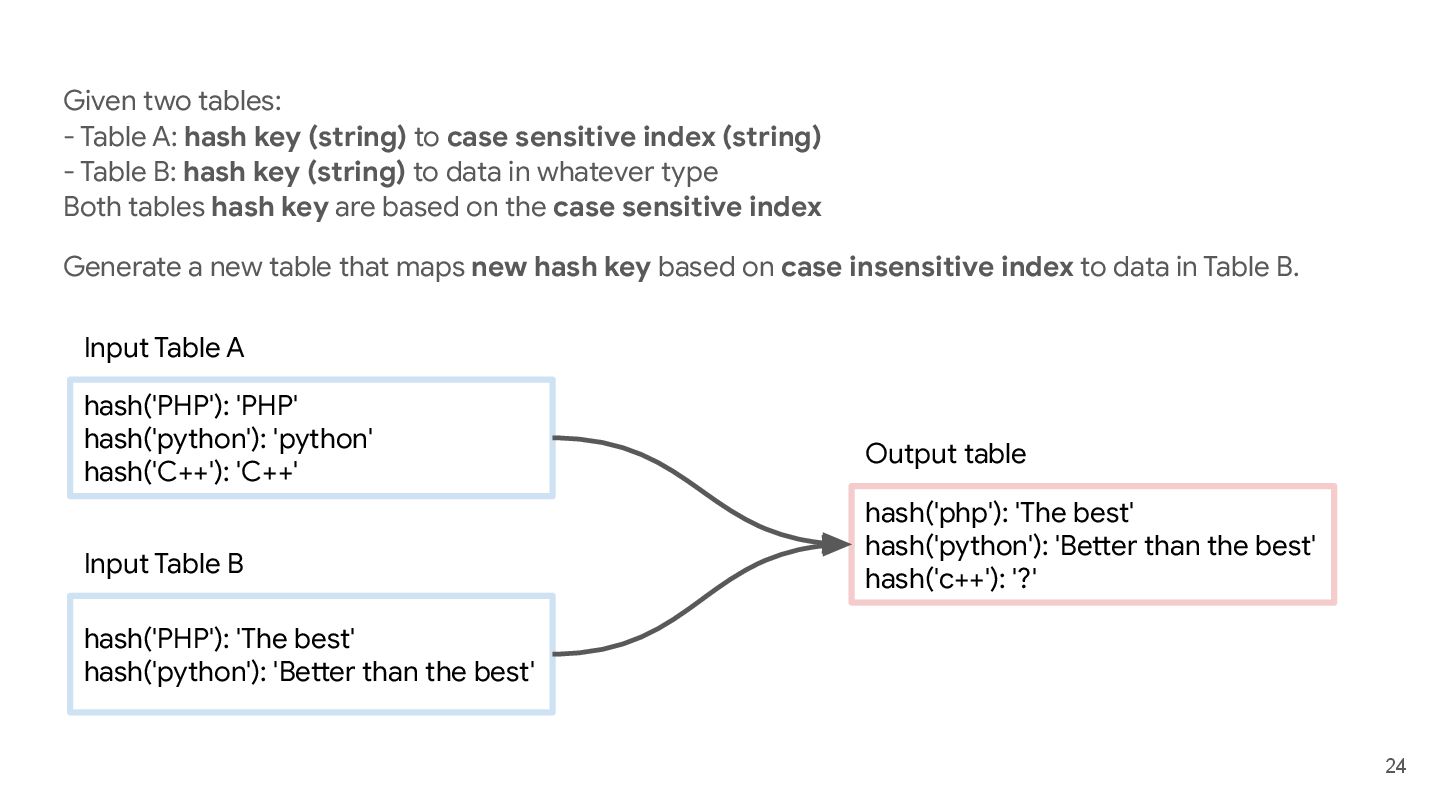 to case sensitive index (string) - Table B: hash key (string) to data in whatever type Both tables hash key are based on the case sensitive index Generate a new table that maps new hash key based on case insensitive index to data in Table B. hash('PHP'): 'PHP' hash('python'): 'python' hash('C++'): 'C++' Input Table A hash('PHP'): 'The best' hash('python'): 'Better than the best' Input Table B hash('php'): 'The best' hash('python'): 'Better than the best' hash('c++'): '?' Output table 20s ⏰