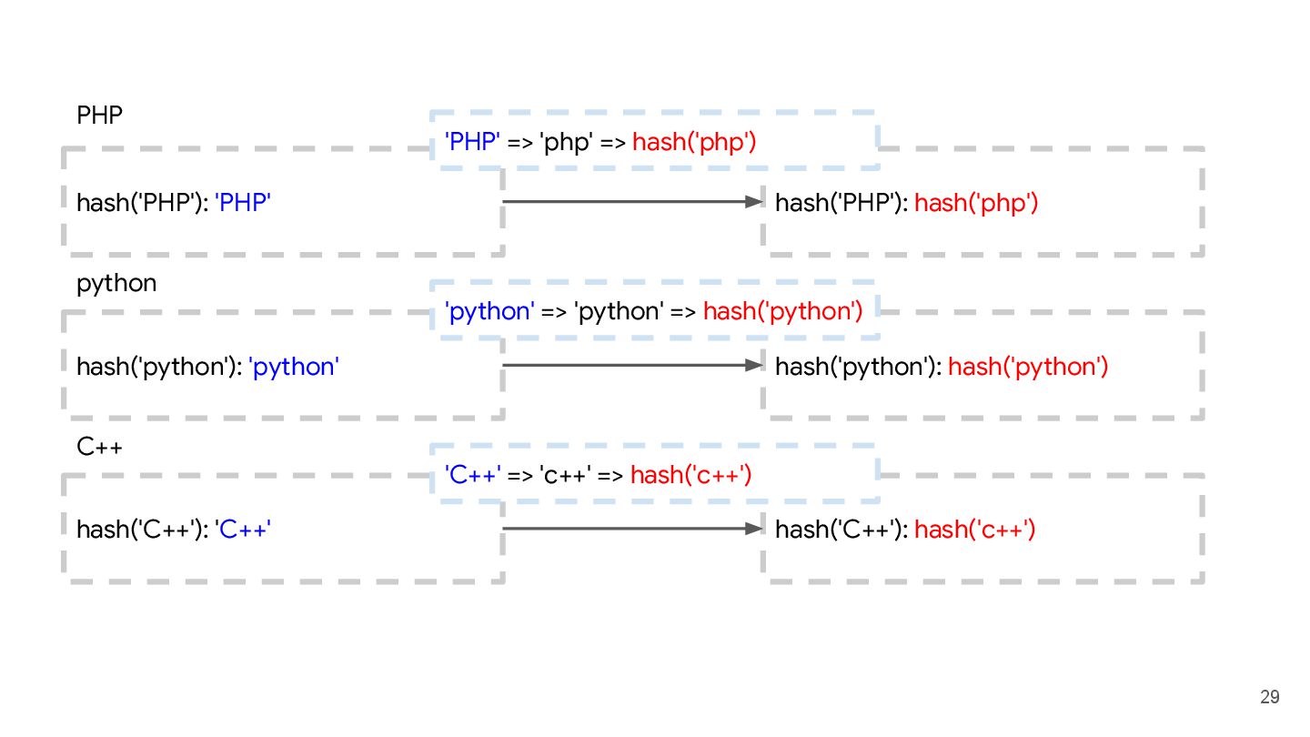 hash('python') hash('python'): 'python' hash('python'): 'Better than the best' python hash('C++'): hash('c++') hash('C++'): 'C++' C++ hash('php'): 'The best' hash('python'): 'Better than the best' hash('c++'): '?'