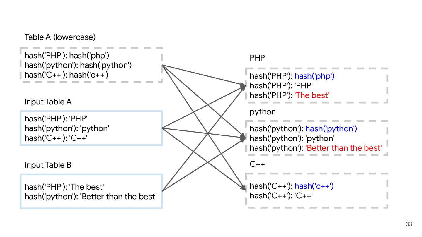 hash('python'): 'python' hash('python'): 'Better than the best' hash('C++'): hash('c++') hash('C++'): 'C++' hash('PHP'): hash('php') hash('python'): hash('python') hash('C++'): hash('c++') Table A (lowercase) hash('PHP'): 'PHP' hash('python'): 'python' hash('C++'): 'C++' Input Table A hash('PHP'): 'The best' hash('python'): 'Better than the best' Input Table B PHP python C++