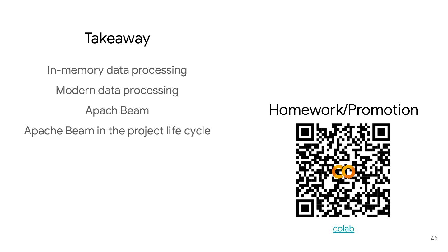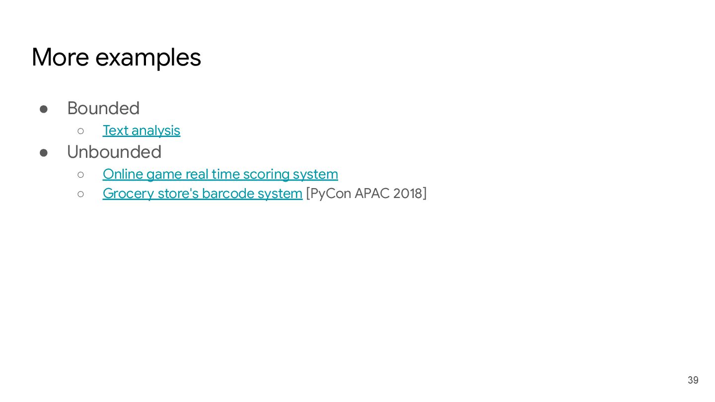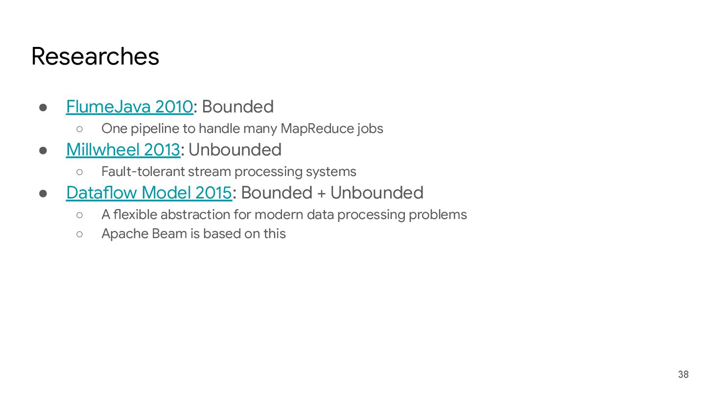 many MapReduce jobs • Millwheel 2013: Unbounded ◦ Fault-tolerant stream processing systems • Dataflow Model 2015: Bounded + Unbounded ◦ A flexible abstraction for modern data processing problems ◦ Apache Beam is based on this 38