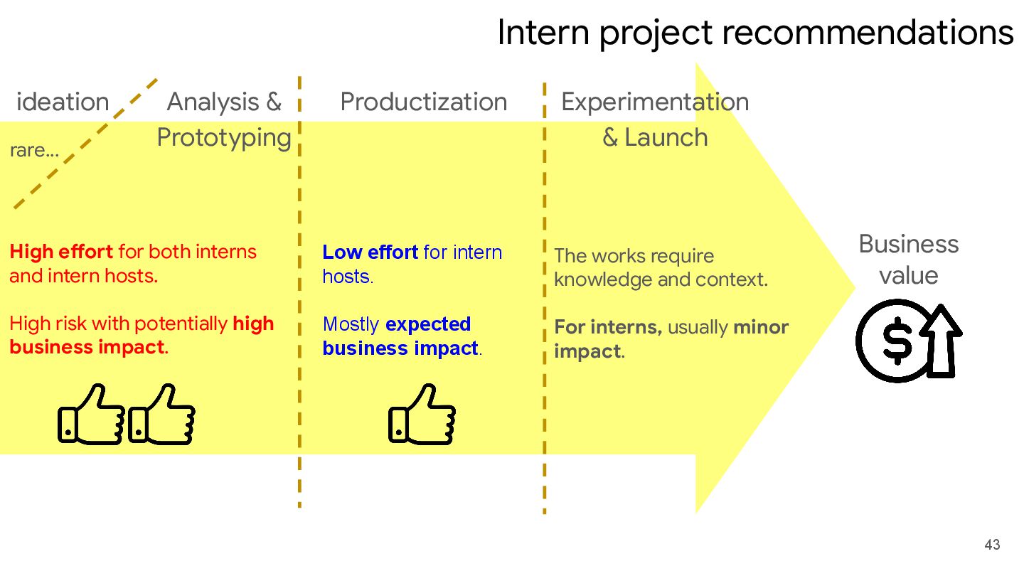 knowledge and context. For interns, usually minor impact. High effort for both interns and intern hosts. High risk with potentially high business impact. Low effort for intern hosts. Mostly expected business impact. ideation Analysis & Prototyping Experimentation & Launch rare…