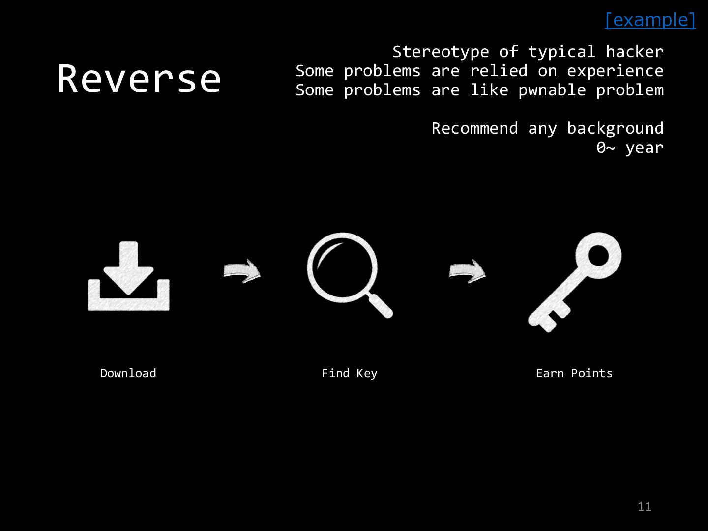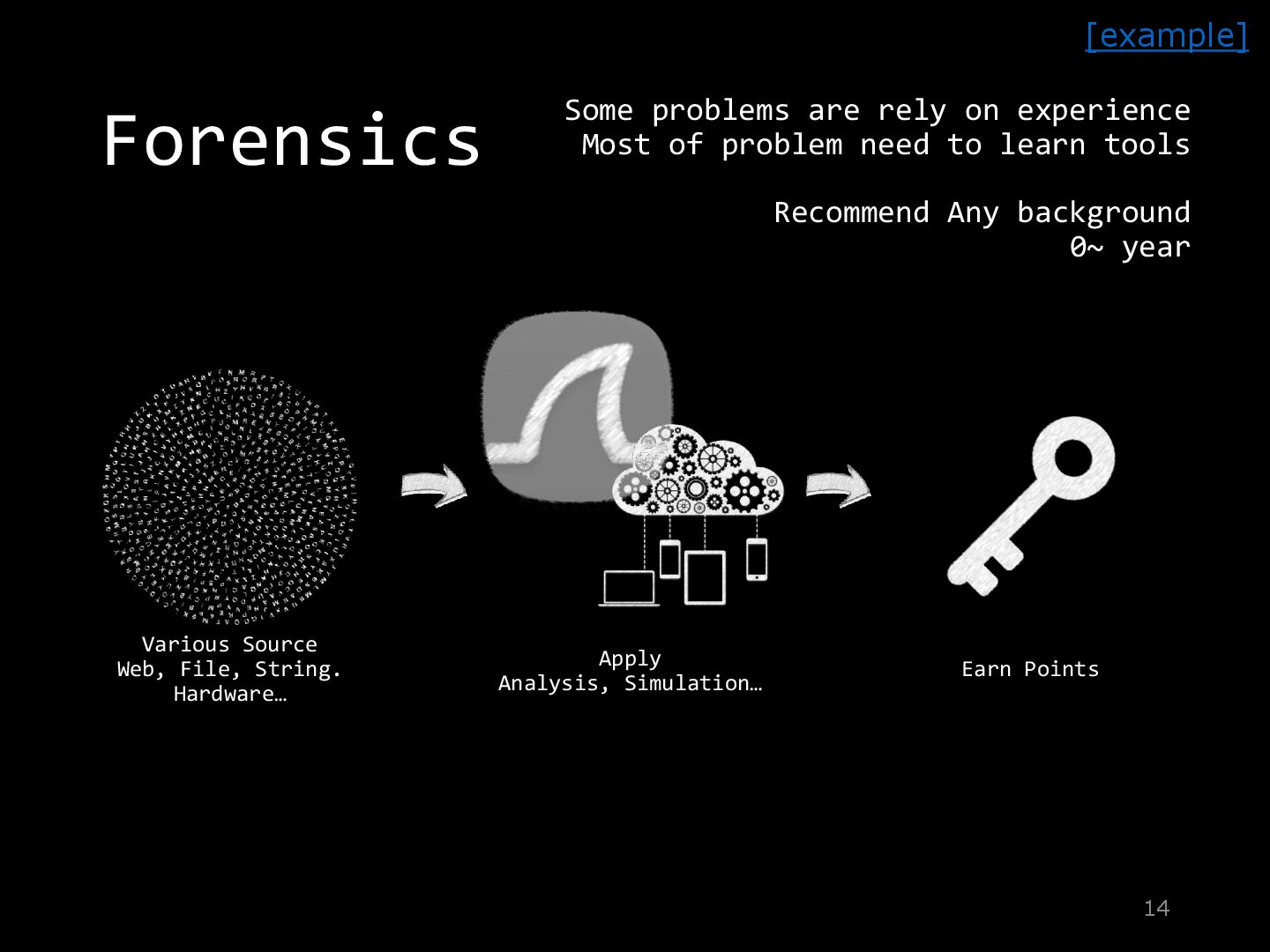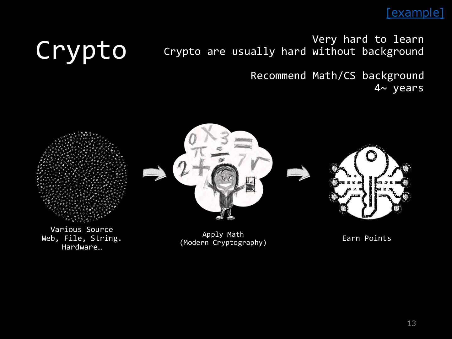 without background Recommend Math/CS background 4~ years Various Source Web, File, String. Hardware… Apply Math (Modern Cryptography) Earn Points [example]