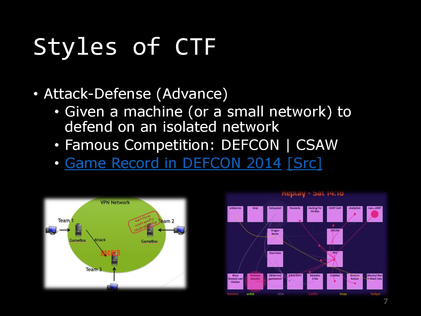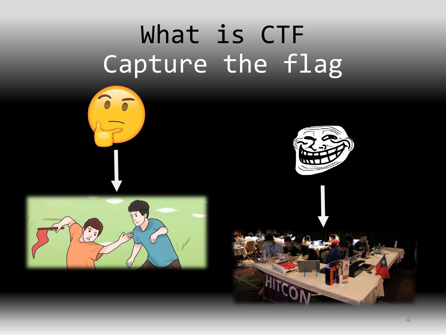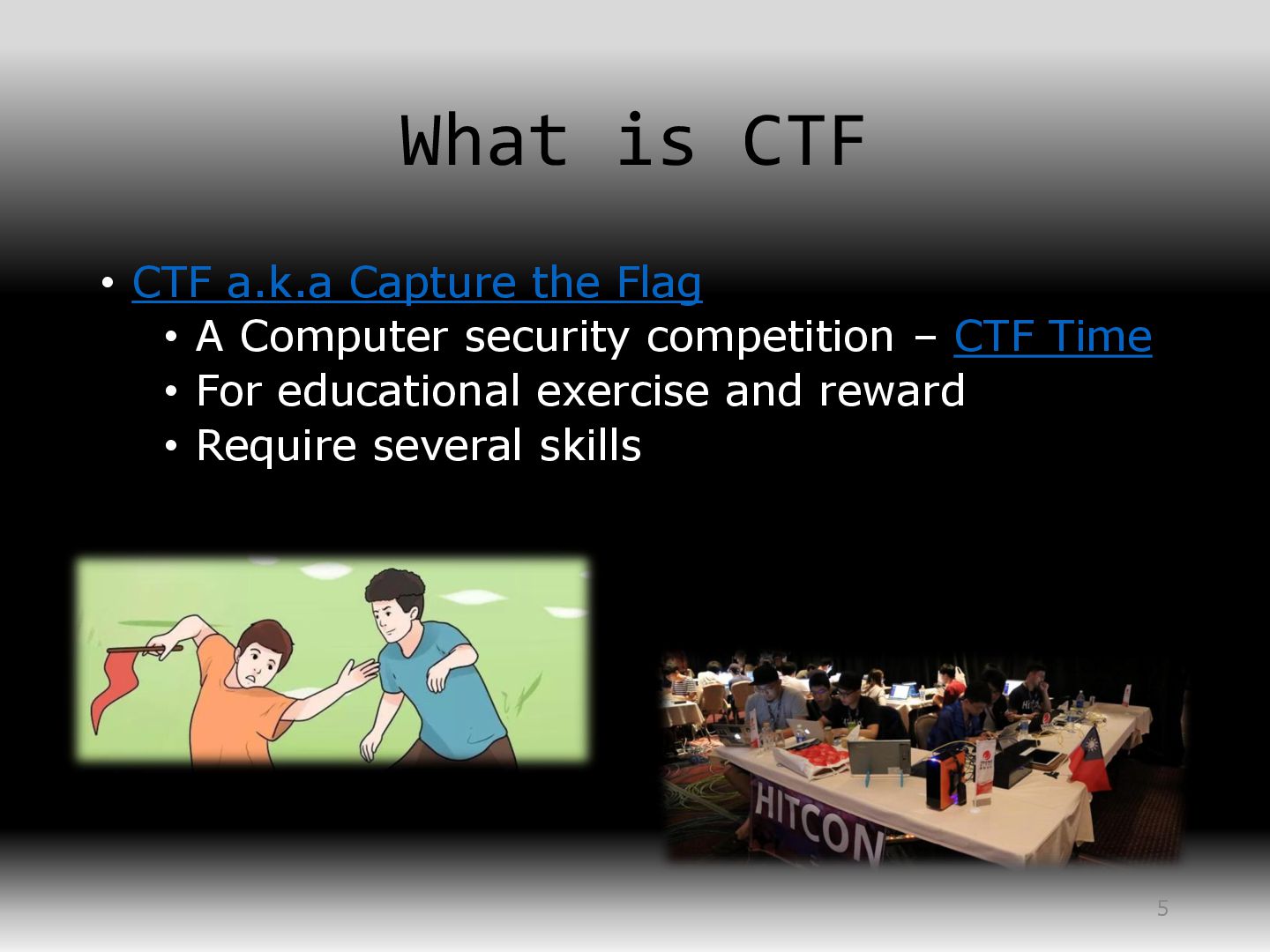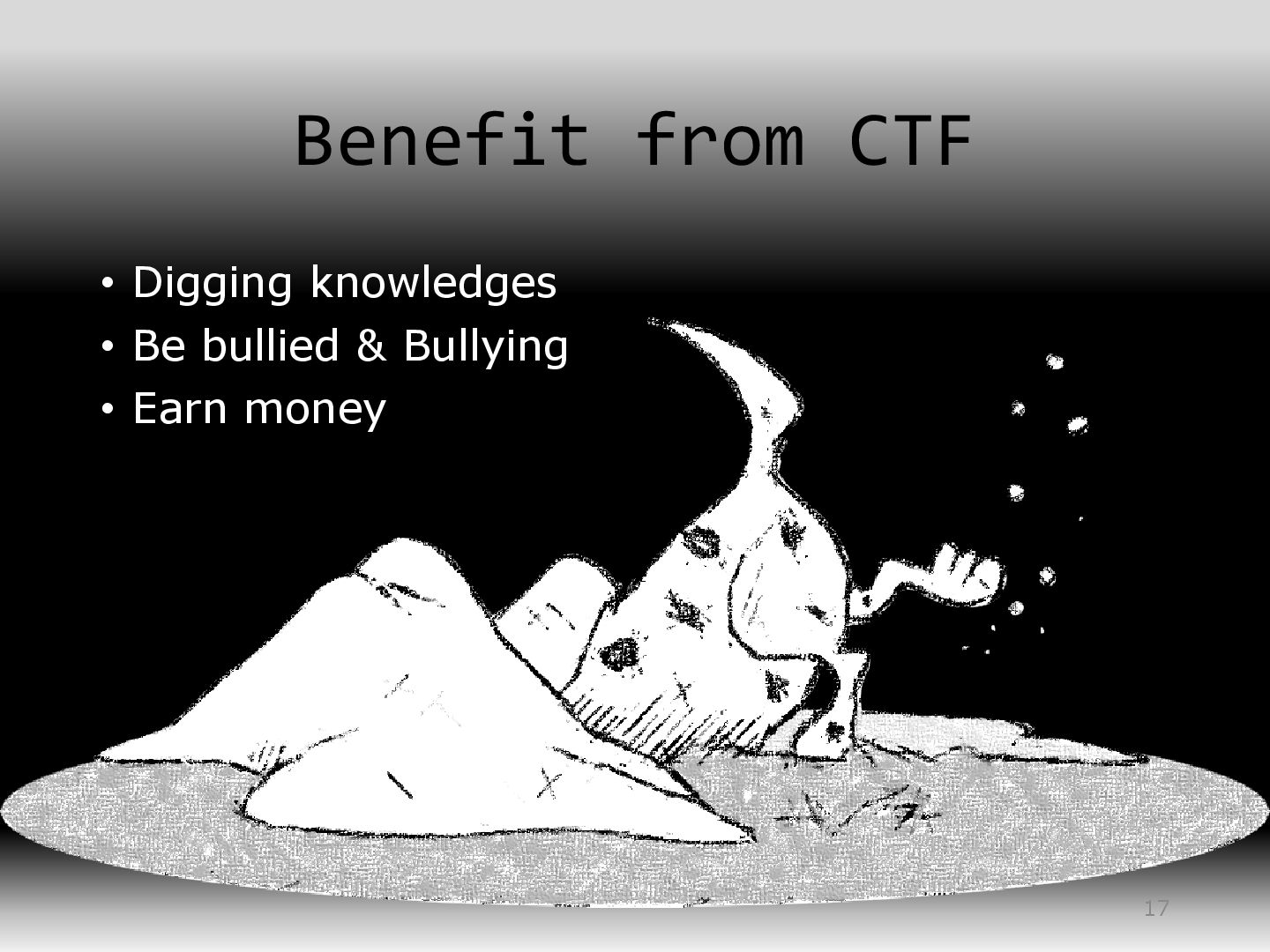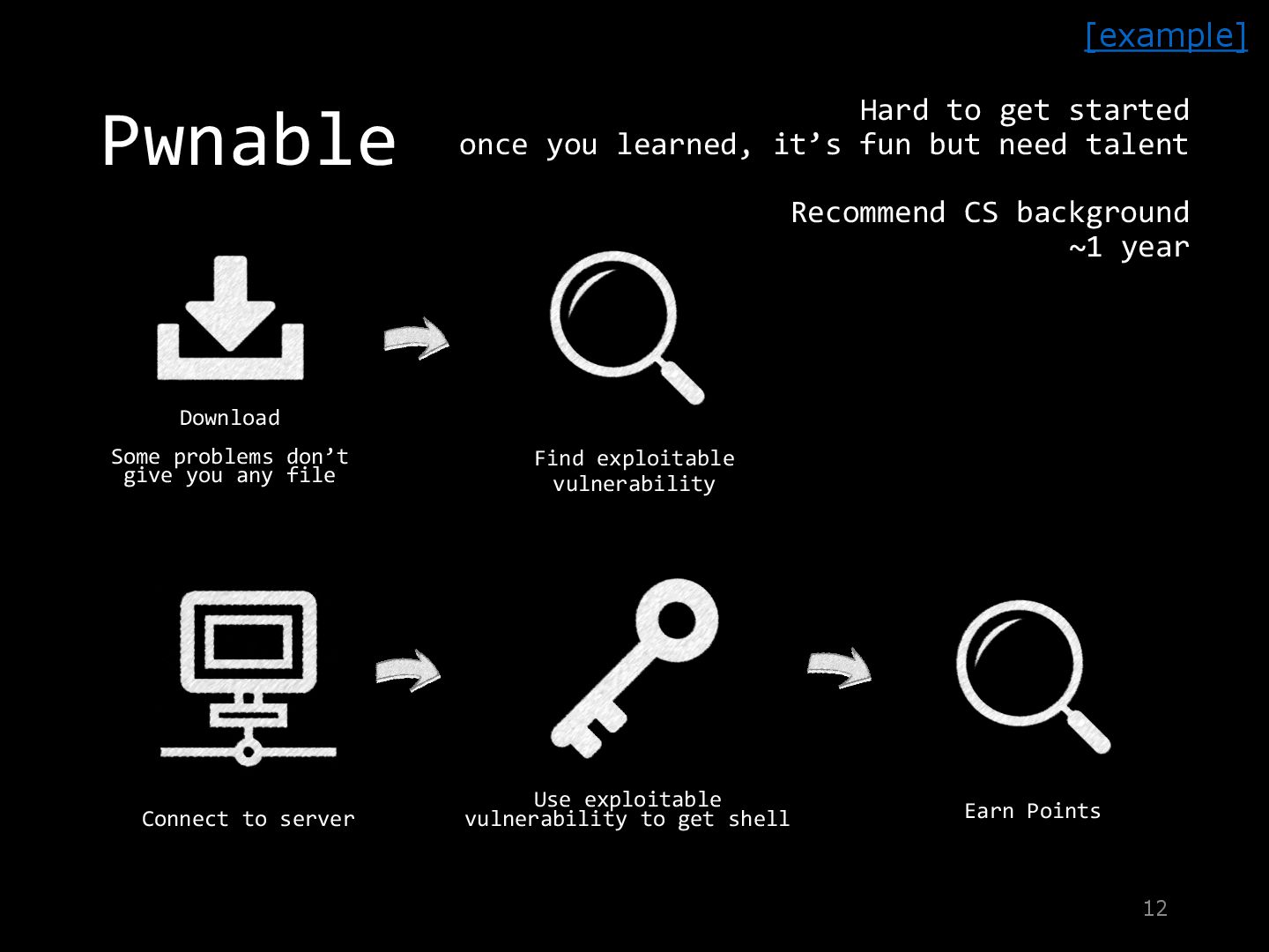 Find exploitable vulnerability Earn Points Connect to server Use exploitable vulnerability to get shell Hard to get started once you learned, it’s fun but need talent Recommend CS background ~1 year [example]