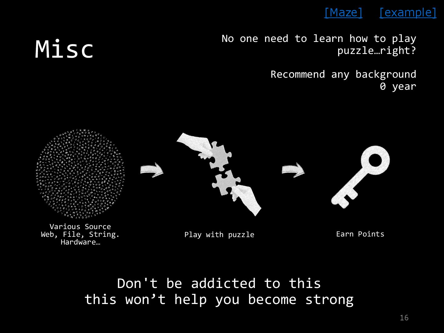 puzzle…right? Recommend any background 0 year Various Source Web, File, String. Hardware… Play with puzzle Earn Points Don't be addicted to this this won’t help you become strong [example] [Maze]